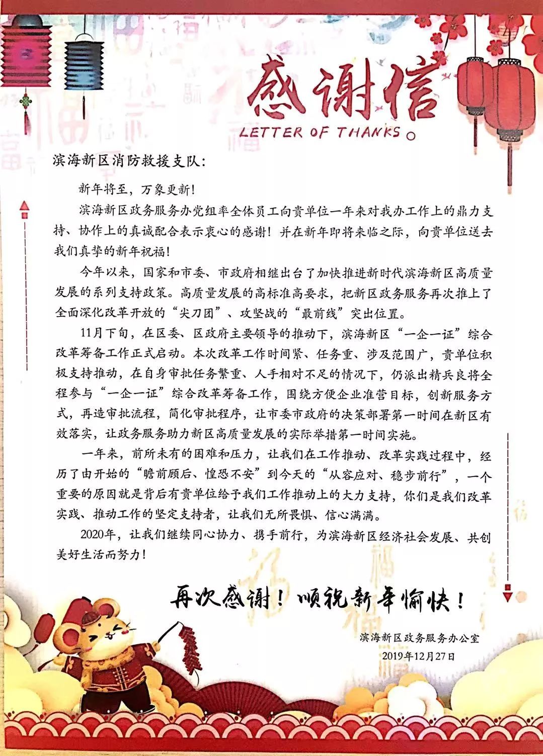 滨海新区作为改革的沃土,创新的摇篮,各类先试先行的革新政策均在这里落实落地。为表彰滨海支队在改革试点中勇于创新的进取精神,在区政务服务办公室向支队发送了改革试点感谢信中指出,滨海新区消防救援支队作为全面深化改革的“尖刀力量”,始终站在改革攻坚的“最前线”。被服务企业也向支队送来了“利企便民护航服务”的感谢锦旗;市主流媒体天津新闻就滨海支队落实“一企一证”进行现场踏勘进行了专题报道。
