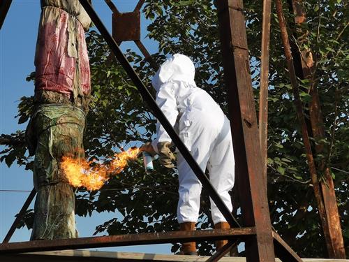 滨海新区消防救援支队福建路消防救援站接到报警及时部署,调派消防救援人员前往处置,途中联系报警人得知在报警之前,报警人的家人在不知情的情况下走到水塔下方准备打开水塔阀门,被马蜂蜇伤。消防救援人员到场后进行实地侦查,发现马蜂窝的大小跟一个篮球差不多,外面仍有多只马蜂不断飞舞,消防救援人员穿戴好防蜂服后,使用点燃的杀虫剂不断往马蜂窝上喷洒,后将蜂窝摘下,拿到院子中进行第二次“火攻”,又将蜂窝踩碎防止蜂窝内有“漏网之蜂”,确保工厂人员不再受到马蜂伤害。