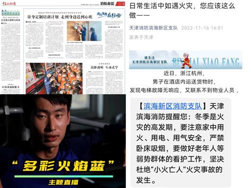 一是各类媒体聚焦,多角度宣传报道。利用政务新媒体账号紧跟近期热点事件,发布社会救助、安全取暖、仓储企业防火等主题形象宣传、安全提示推文200余条;津云、今晚报发稿《他用逆火前行 诠释最“燃”青春》,应急管理报、津滨海APP、微滨城视频号发布新区“119”消防宣传月启动仪式、相关活动稿件10余条;策划并组织“多彩火焰蓝——消防员技能对抗赛”主题网络直播活动,依托网络展示新时代消防员形象,强化互动引热度,通过互动问答科普消防安全知识,并抽取幸运粉丝邮寄消防宣传文创产品以资鼓励,合计在线观看人数3万余人;依托媒体曝光火灾隐患单位和场所数家,通过媒体监督推动整改了一批火灾隐患。