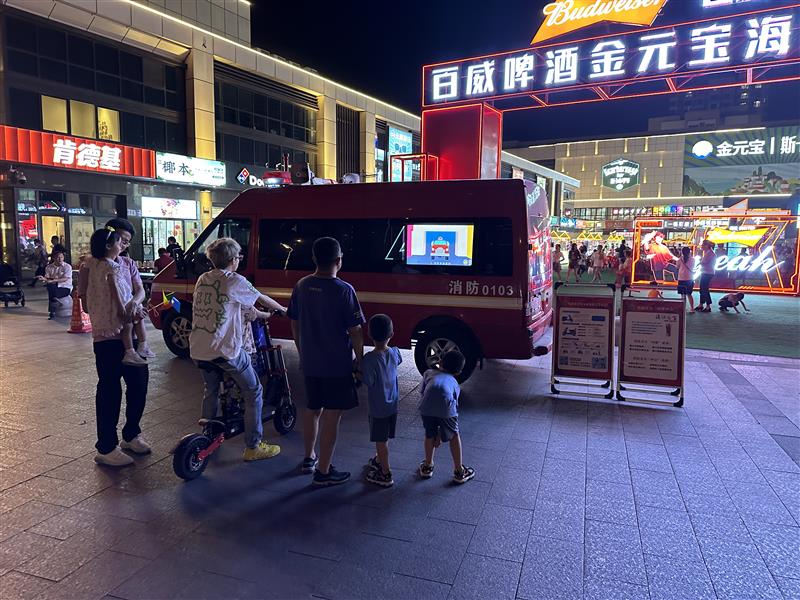 支队宣传人员将流动宣传车停放在夜市、集市出入口处,利用触目惊心的火灾案例视频等声光影像向过往群众进行“泪点”宣传,提高群众的消防安全意识。此外,宣传人员在热门摊位附近摆设消防宣传摊位,摆放灭火器、防烟面罩等消防器材及消防知识宣传资料和消防文创产品,现场示范讲授防火常识和消防器材使用方法。“消防地摊”前,前来取“消防经”的群众络绎不绝,消防宣传人员耐心解答群众提出的消防安全问题,并介绍了如何检查家庭火灾隐患、如何扑救初期火灾、火场如何逃生自救等消防安全常识。