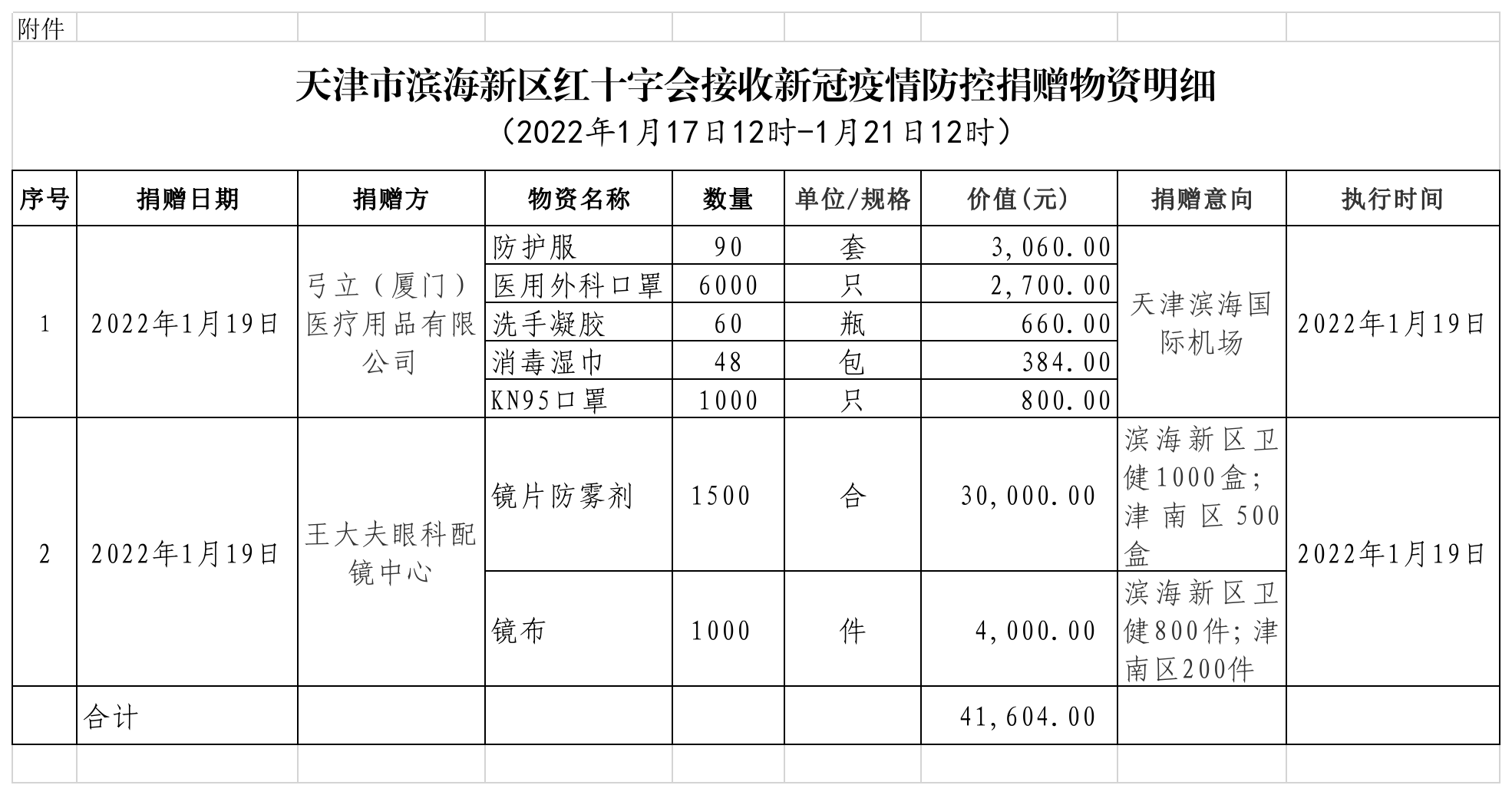 自2022年1月17日12时—1月21日12时,天津市滨海新区红十字会接收定向捐赠物资2笔,折合价值41604元,已按捐赠意愿完成发放工作。