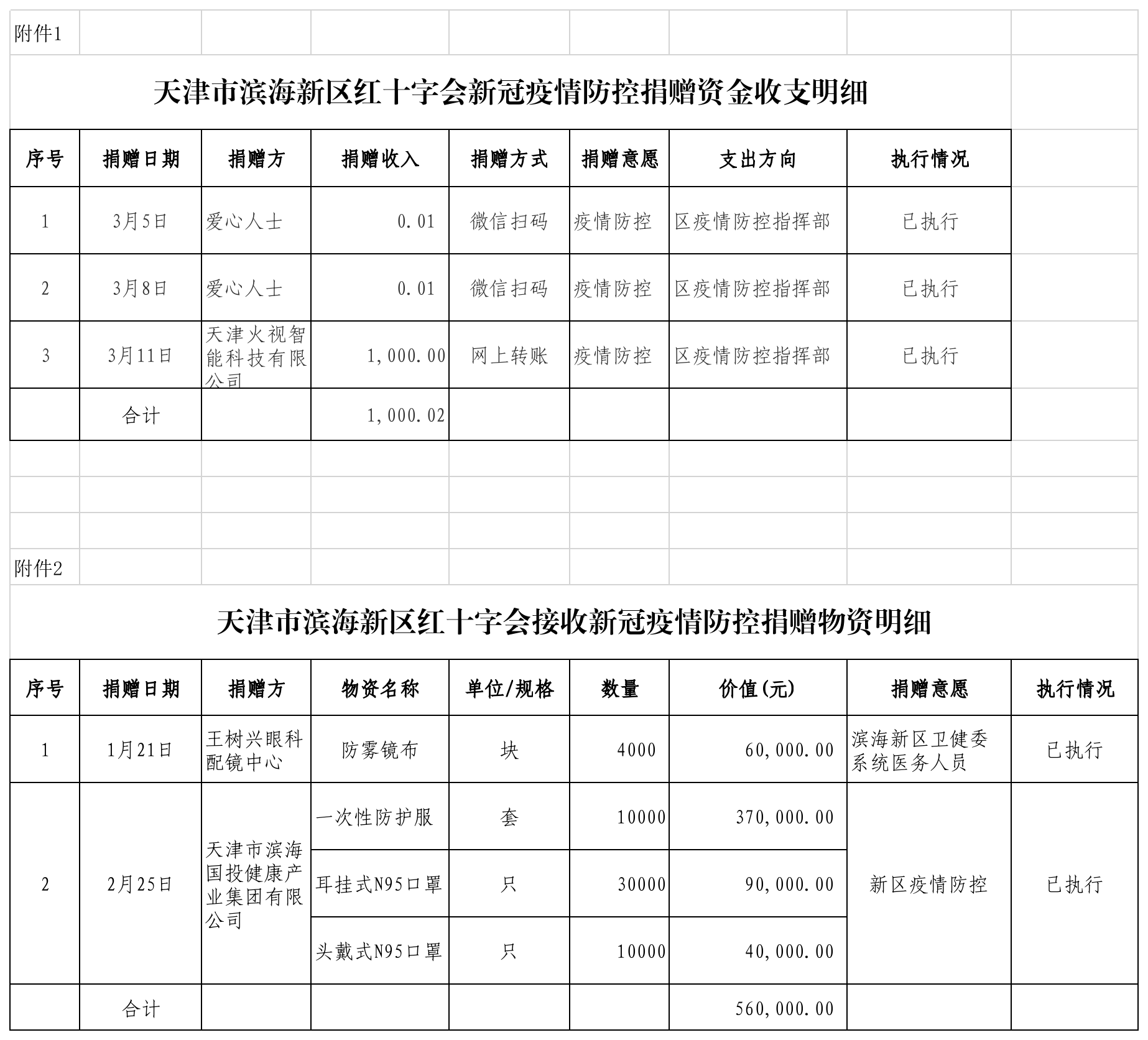 自2022年2月11日12时至2022年3月18日12时,天津市滨海新区红十字会接收疫情捐款3笔,共计1000.02元;接收捐赠防疫物资1笔,折合价值500000元。