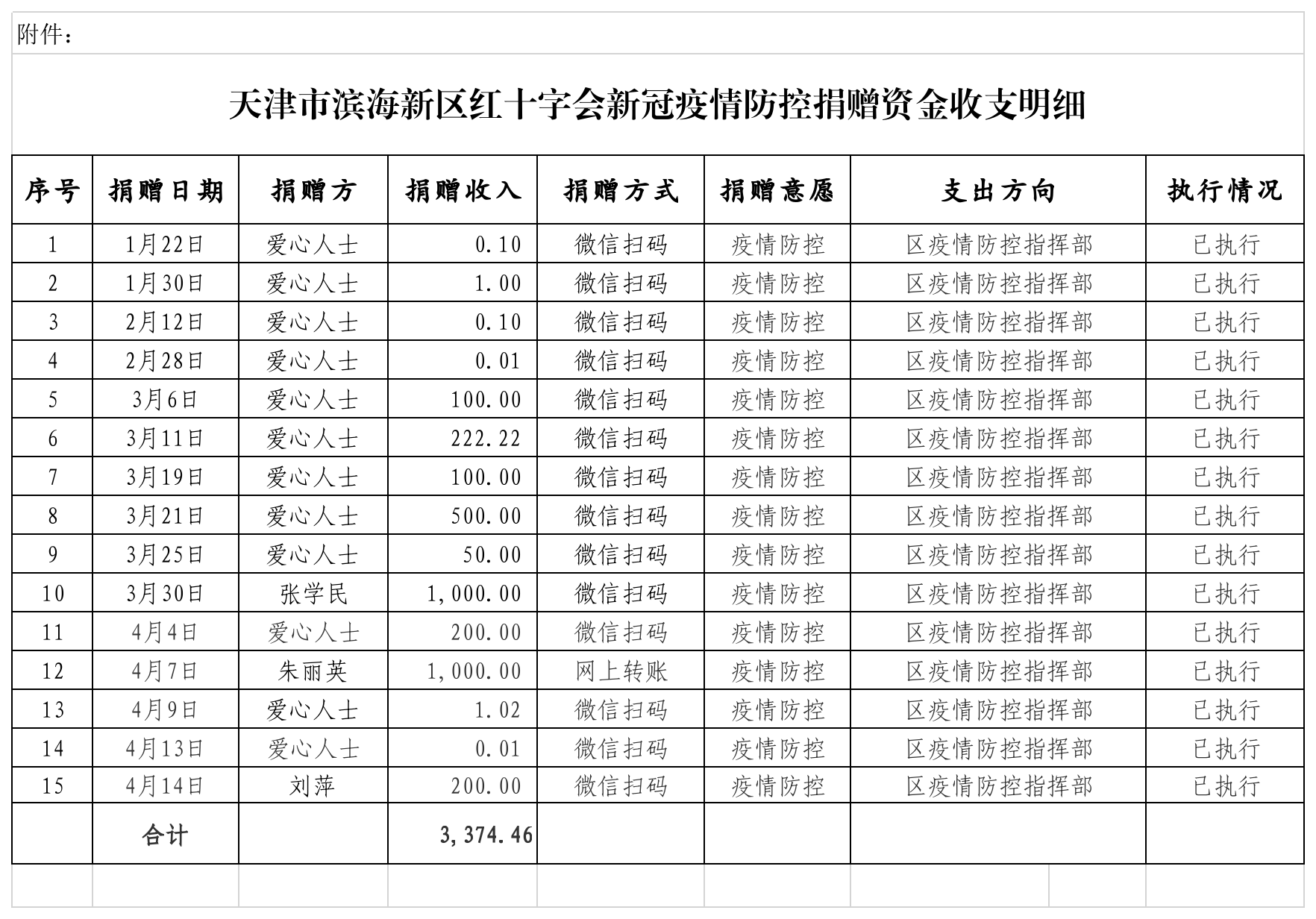 附件:天津市滨海新区红十字会新冠疫情防控捐赠资金收支情况统计表(2022年4月2日12时至2022年4月15日12时)