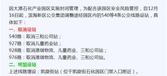 因大港石化产业园区实施封闭管理,为配合该园区安全风险管控,自12月16日起,滨海新区公交集团调整途经园区内的540等4条公交线路设站,具体如下: