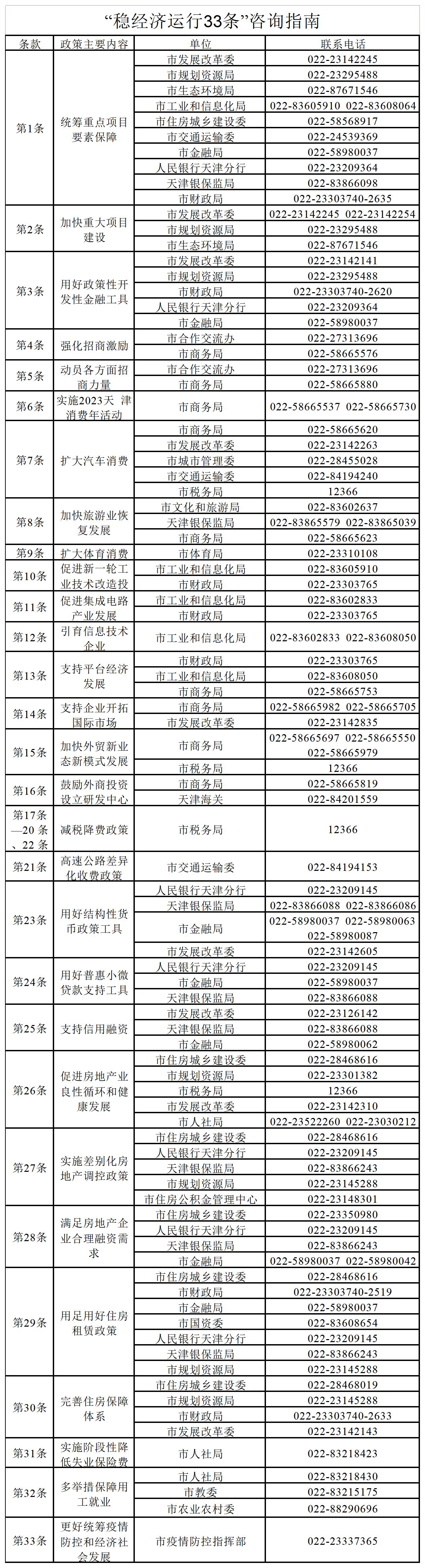 为切实做好《关于着力推动经济运行一季度良好开局全年整体好转的政策措施》(简称“稳经济运行33条”)政策解读,加快释放政策效能,现公布具体政策条款涉及单位的咨询联络方式,接受企业、单位来电咨询。