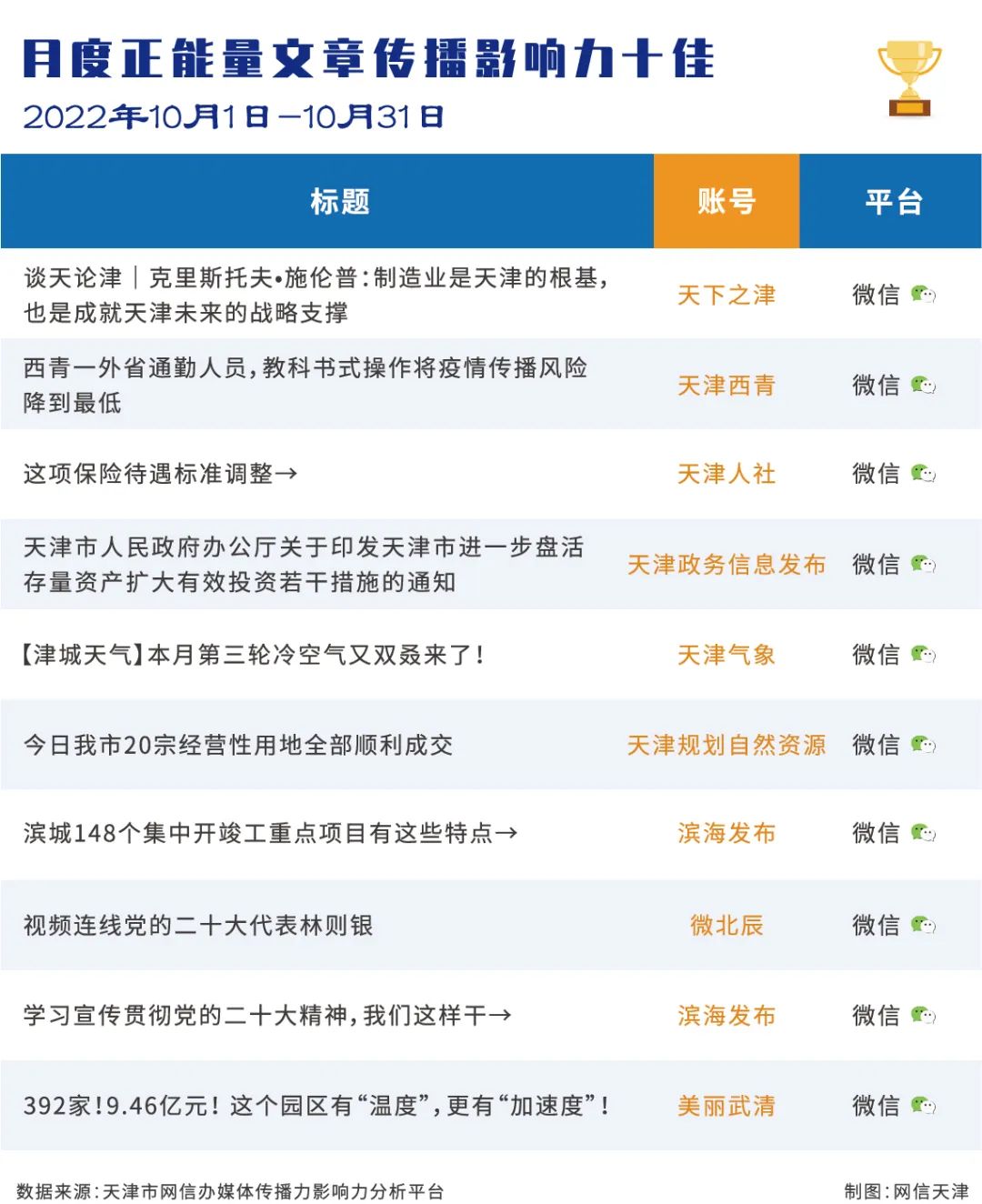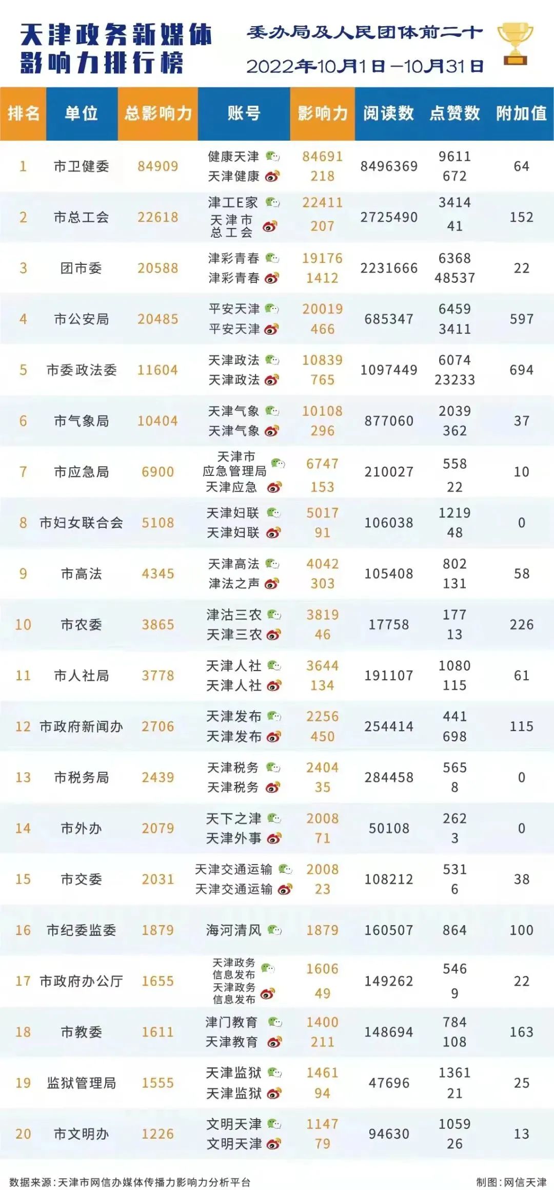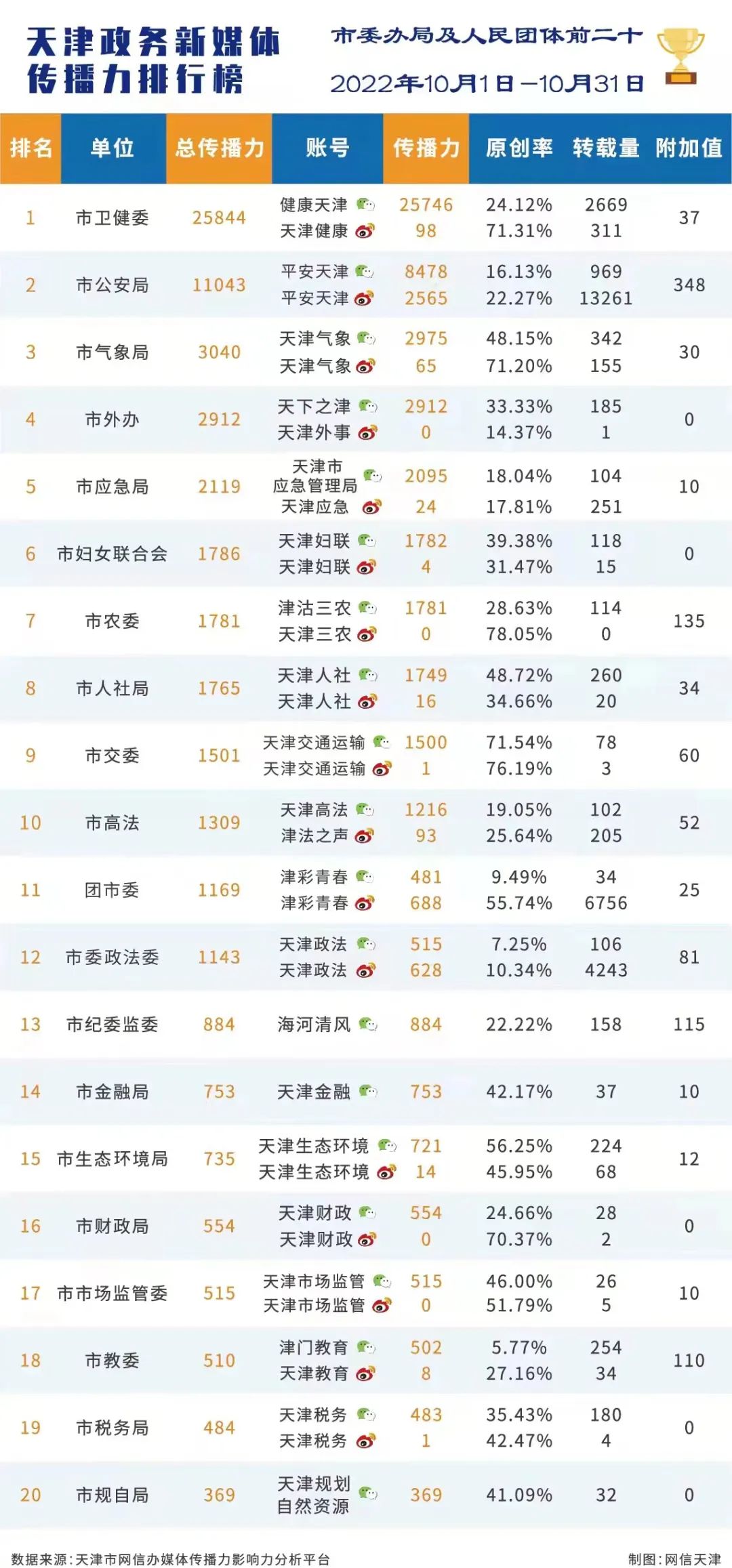 市委网信办发布天津政务新媒体2022年10月份传播影响力排行榜