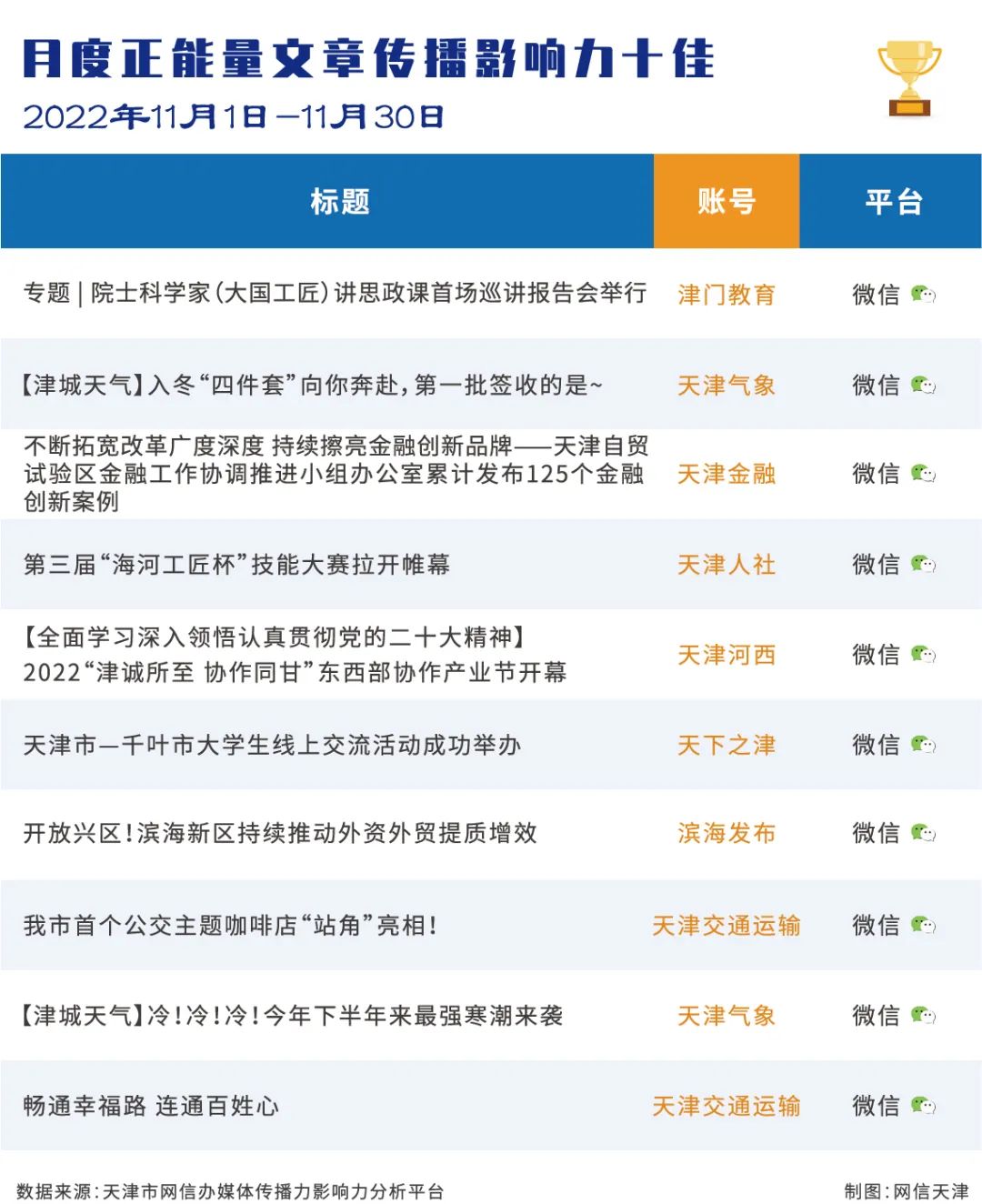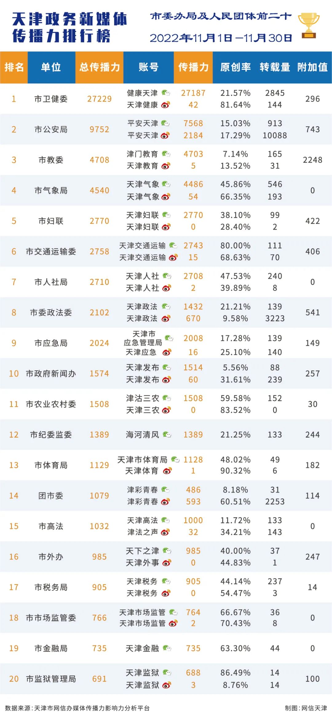 2022年第十一期天津市政务新媒体传播影响力排行榜发布