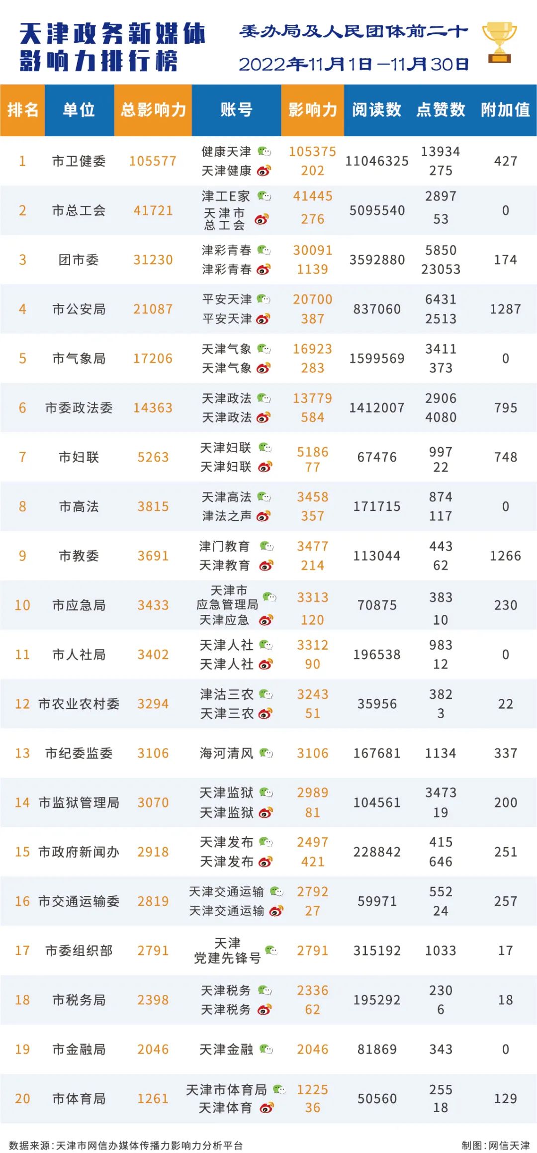市委网信办发布天津政务新媒体2022年11月份传播影响力排行榜