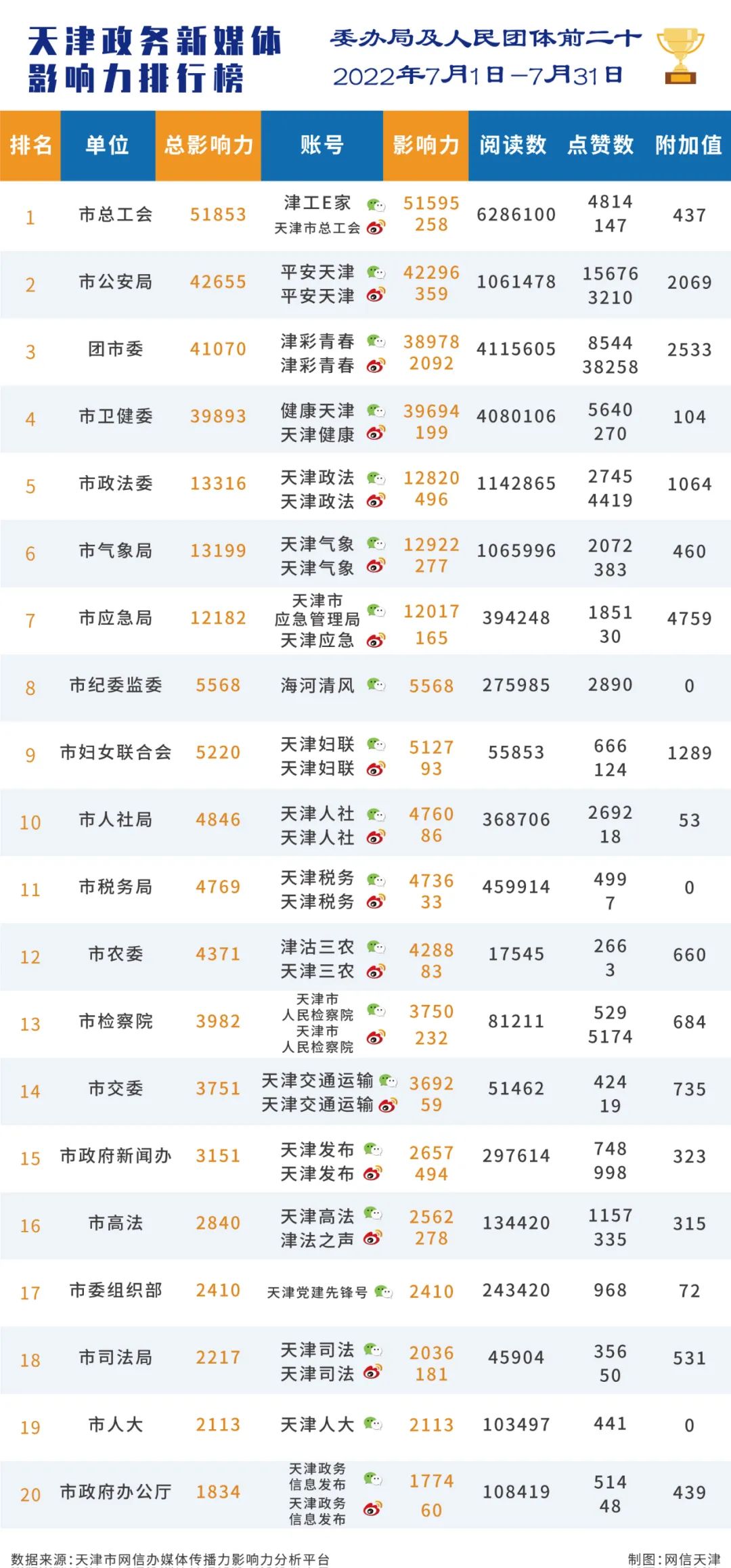 市委网信办发布天津政务新媒体2022年7月份传播影响力排行榜