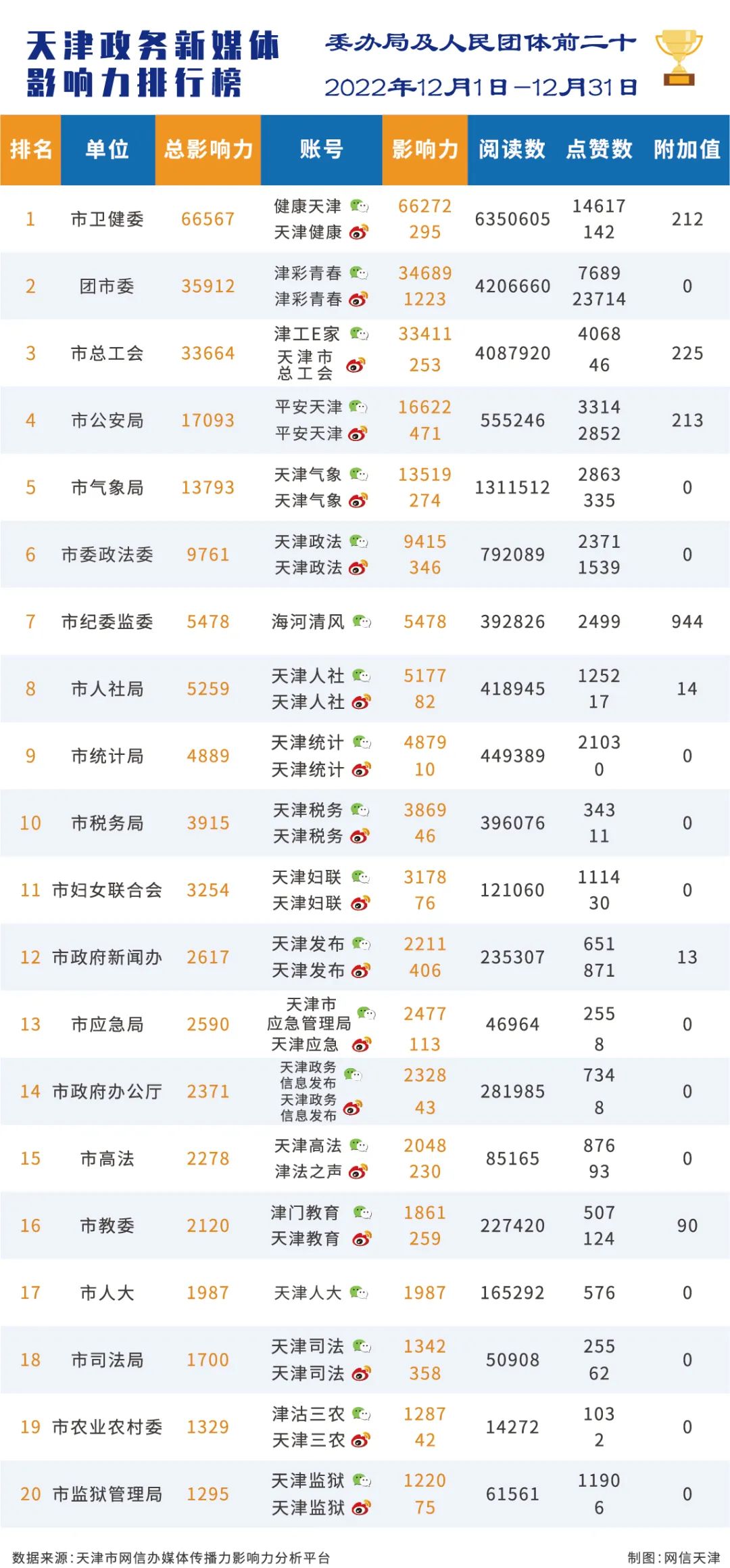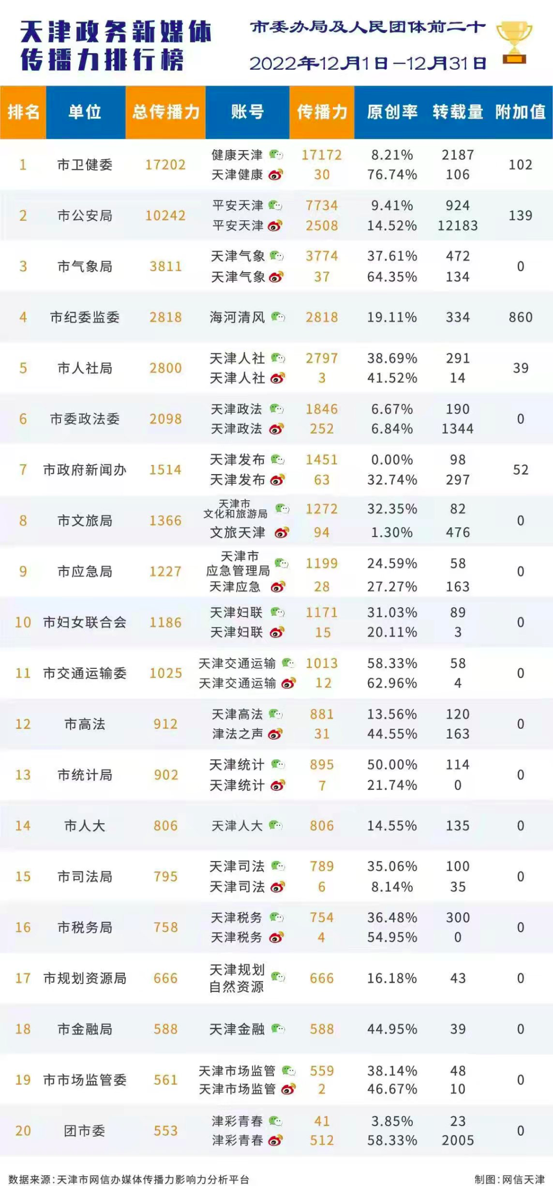 市委网信办发布天津政务新媒体2022年12月份传播影响力排行榜