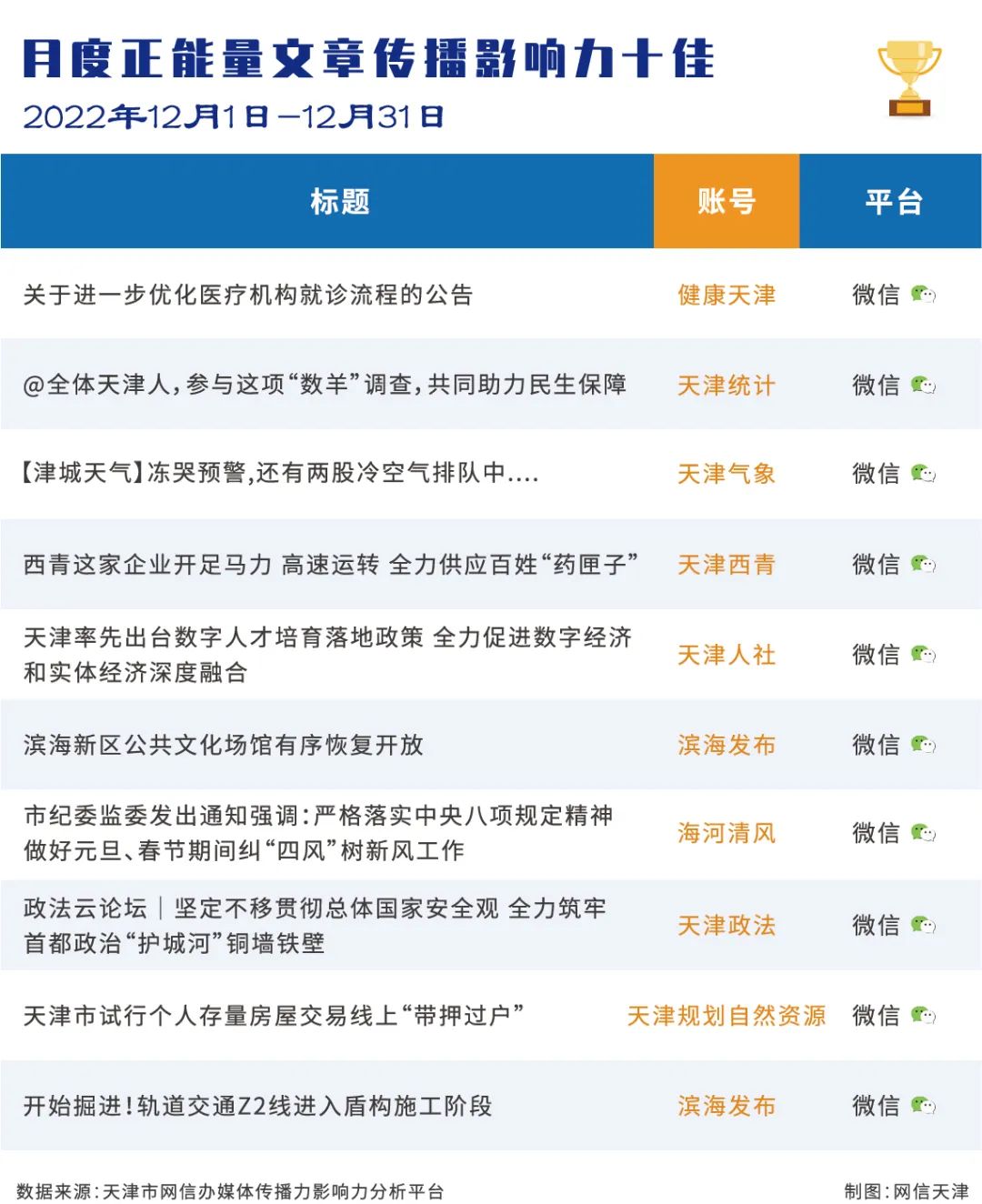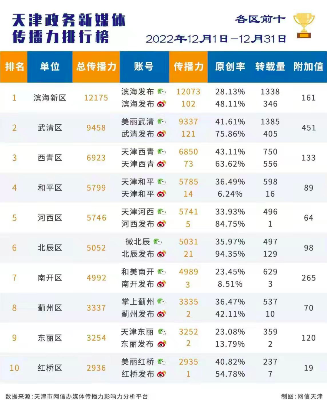2022年第十二期天津市政务新媒体传播影响力排行榜发布