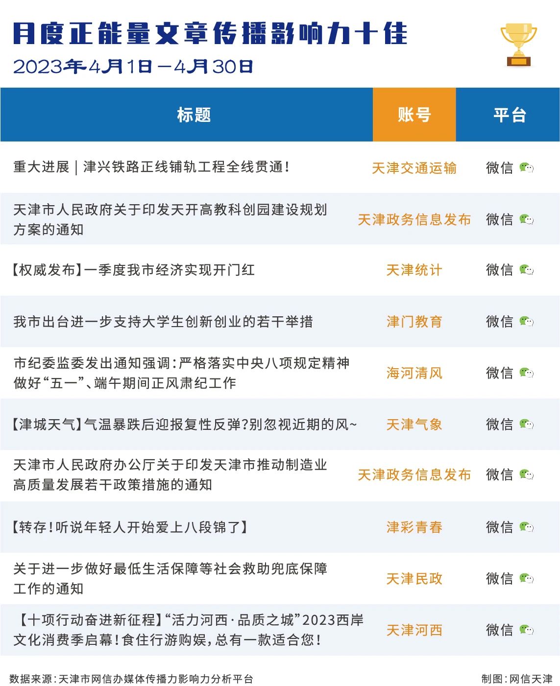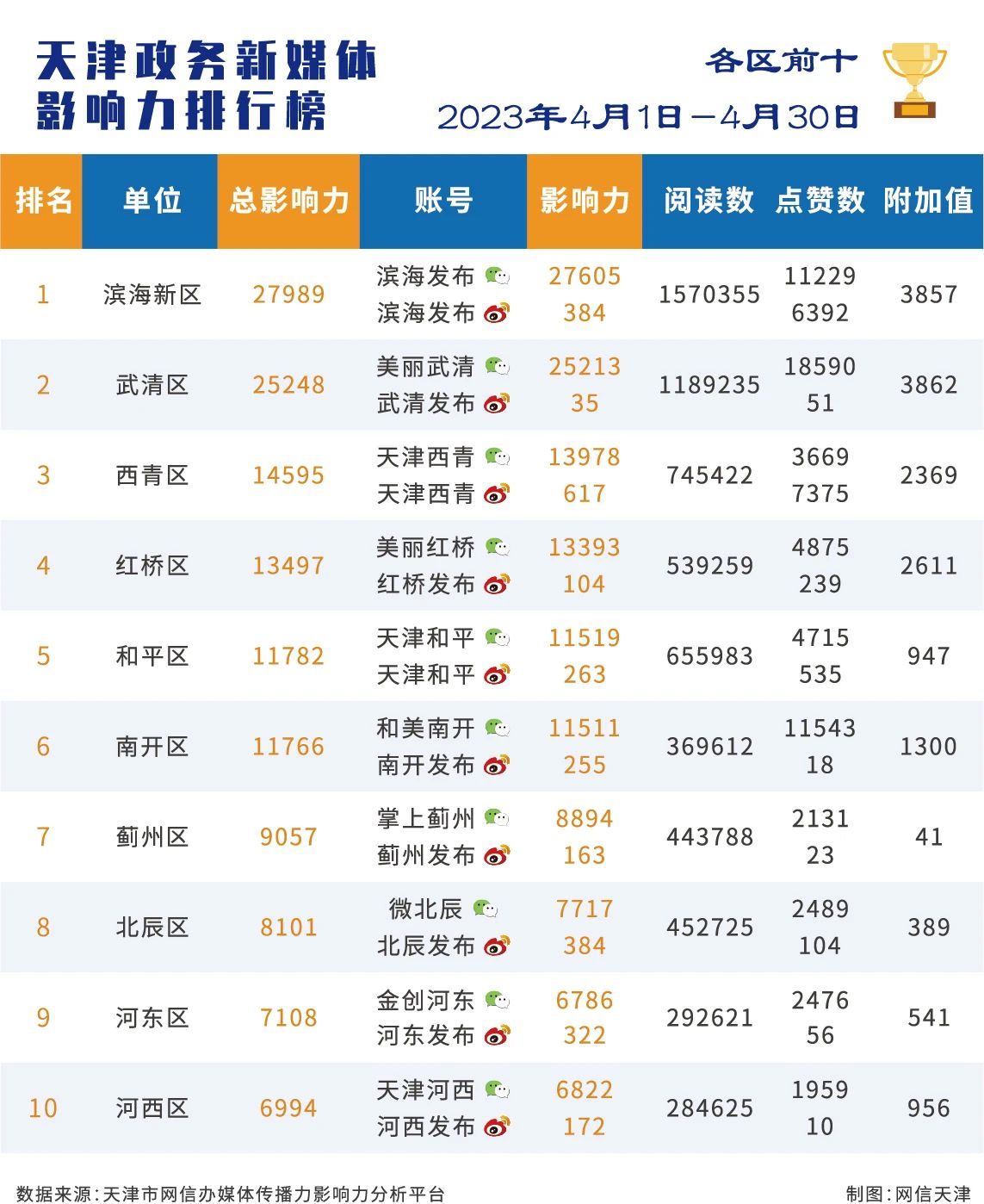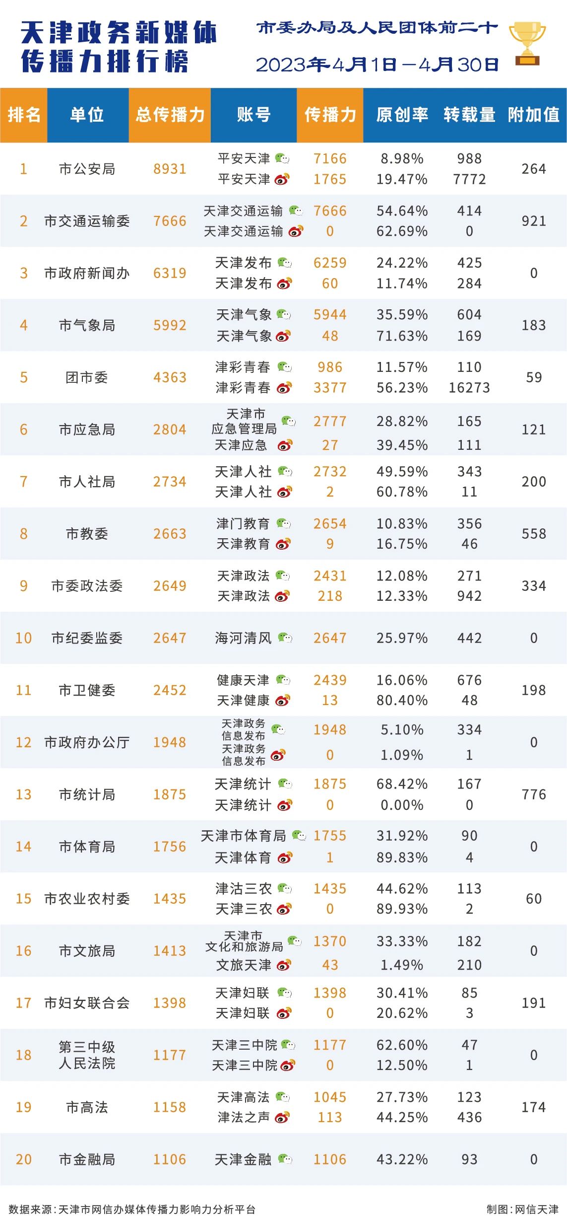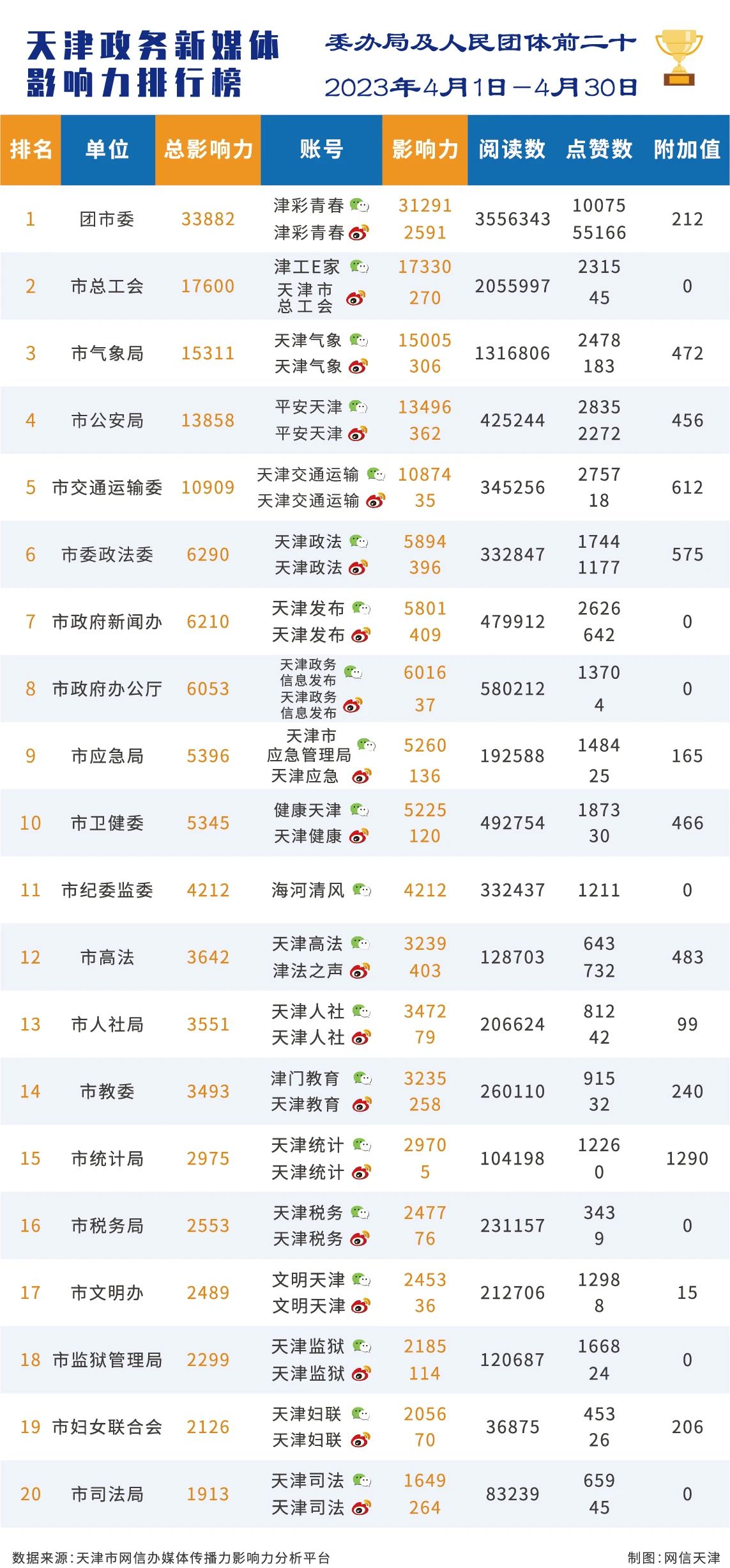 | 2023年4月份天津政务新媒体传播影响力排行榜 |