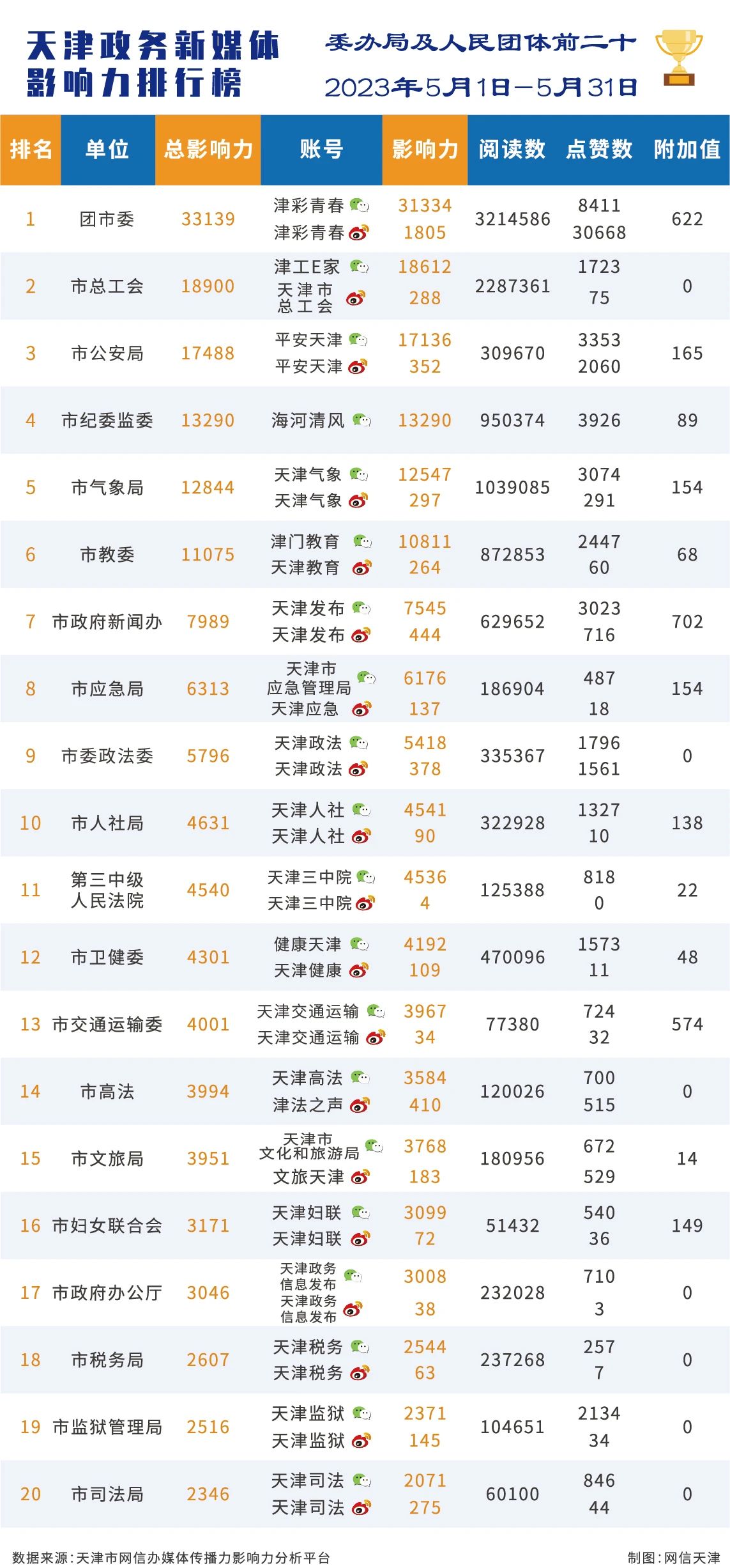 | 2023年5月份天津政务新媒体传播影响力排行榜 |