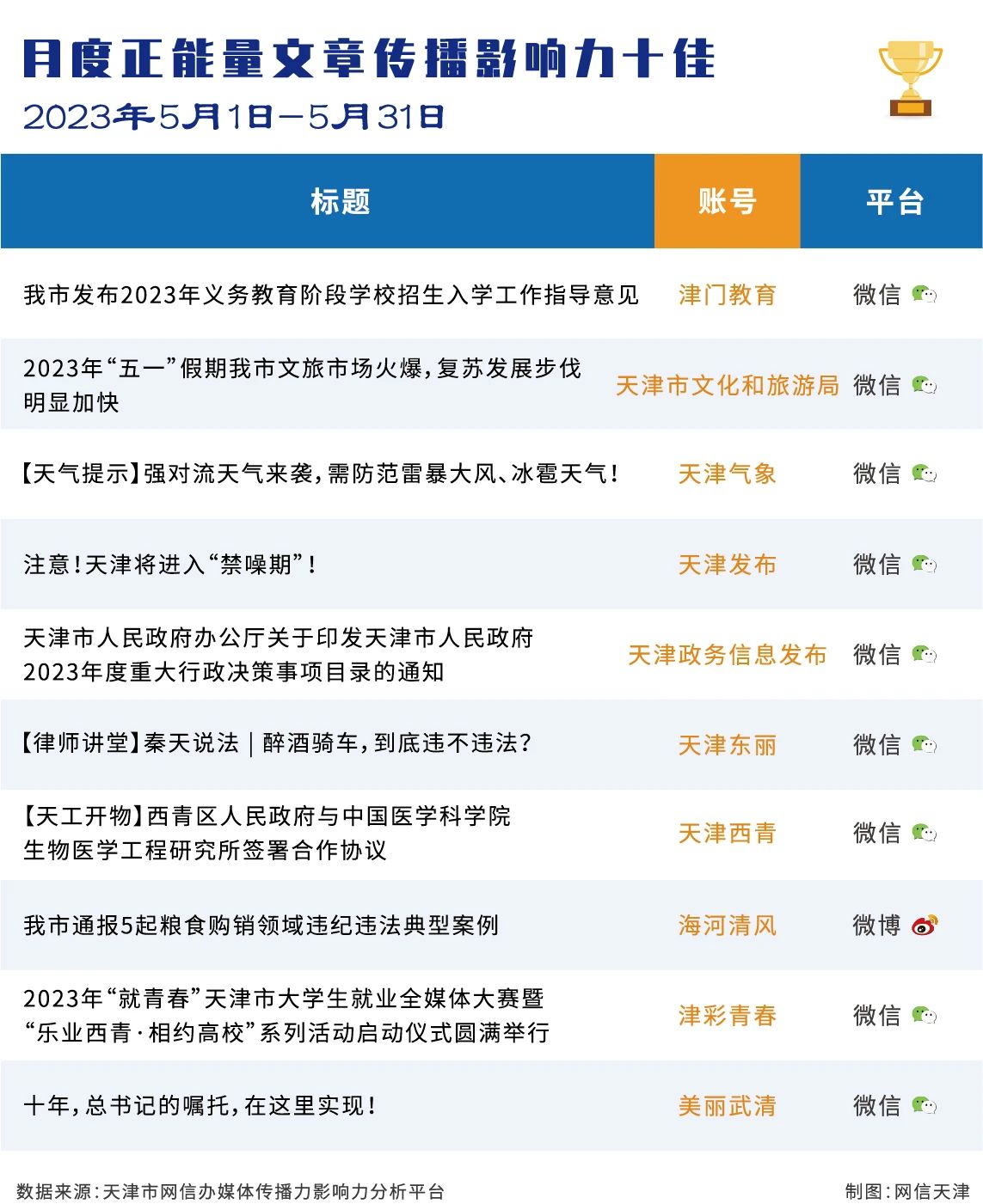 市委网信办发布天津政务新媒体2023年5月份传播影响力排行榜