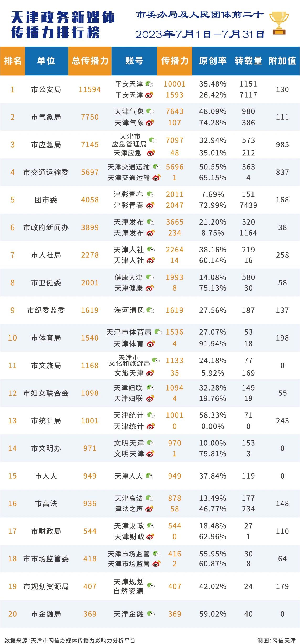 市委网信办发布天津政务新媒体2023年7月份传播影响力排行榜