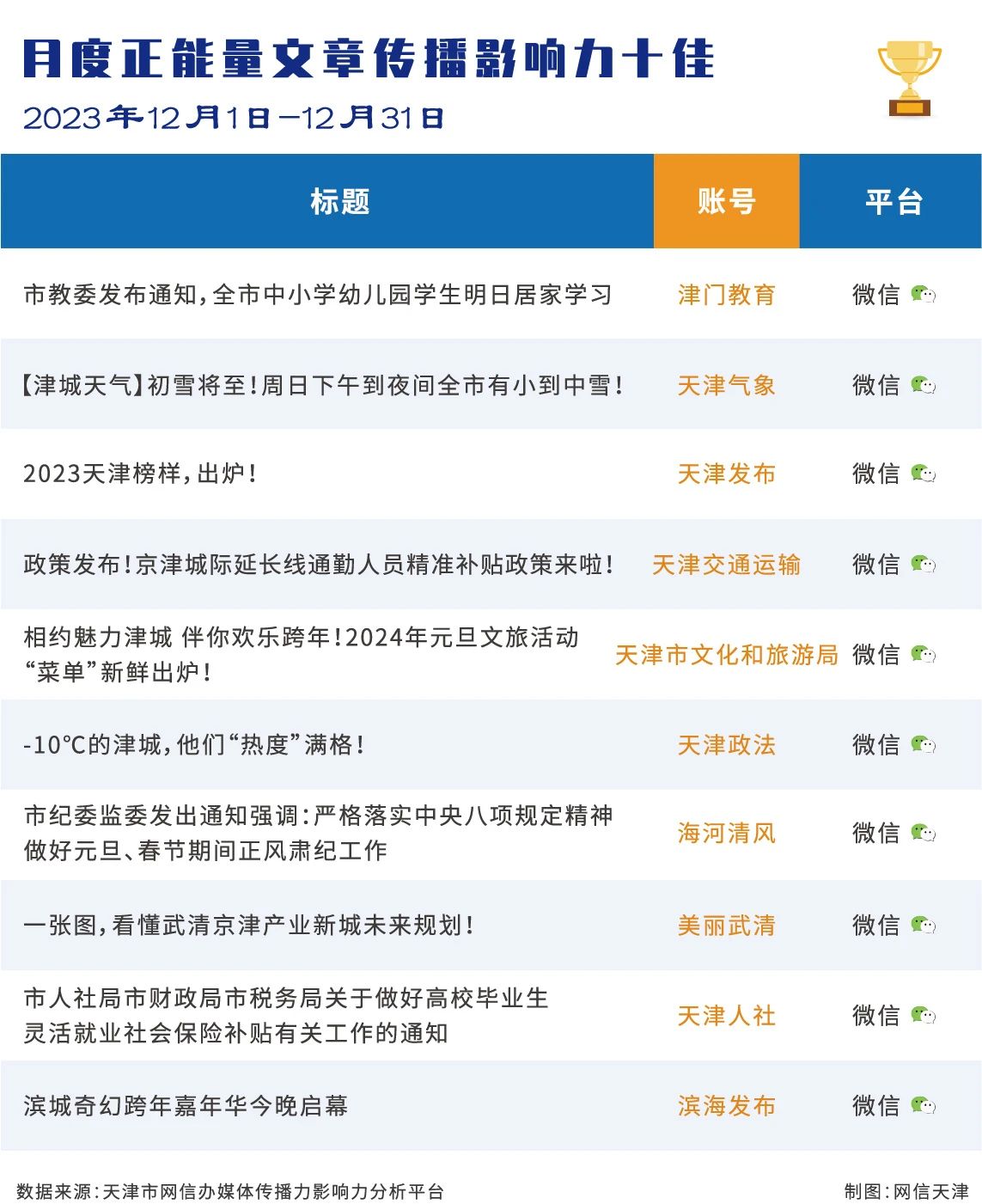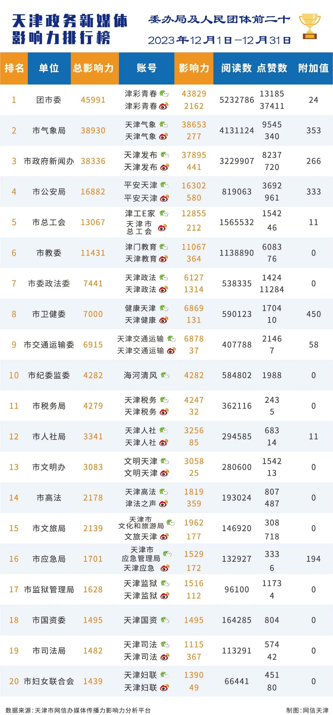 市委网信办发布天津政务新媒体2023年12月份传播影响力排行榜