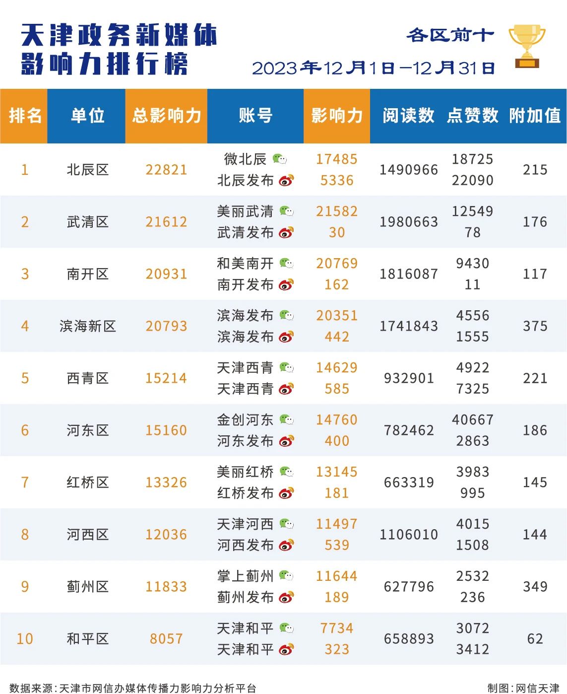 2023年第十二期天津市政务新媒体传播影响力排行榜发布