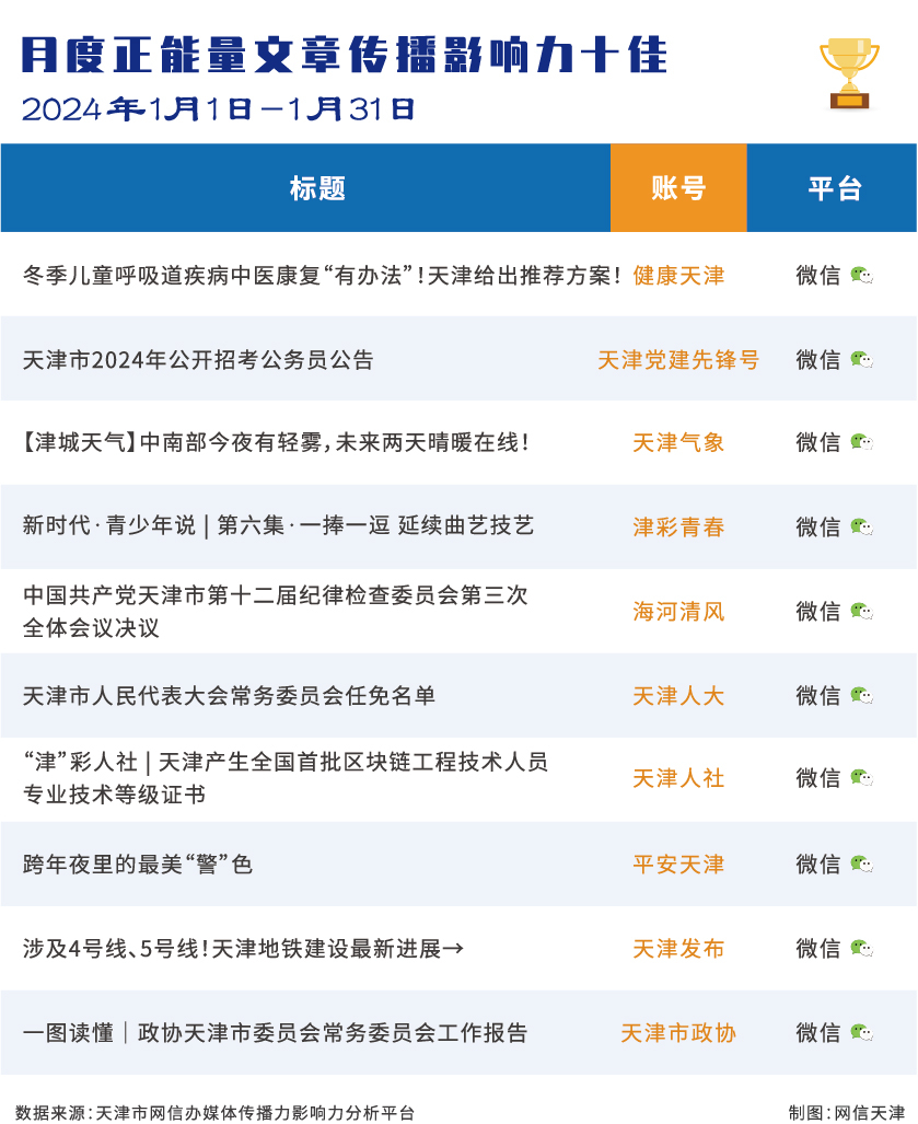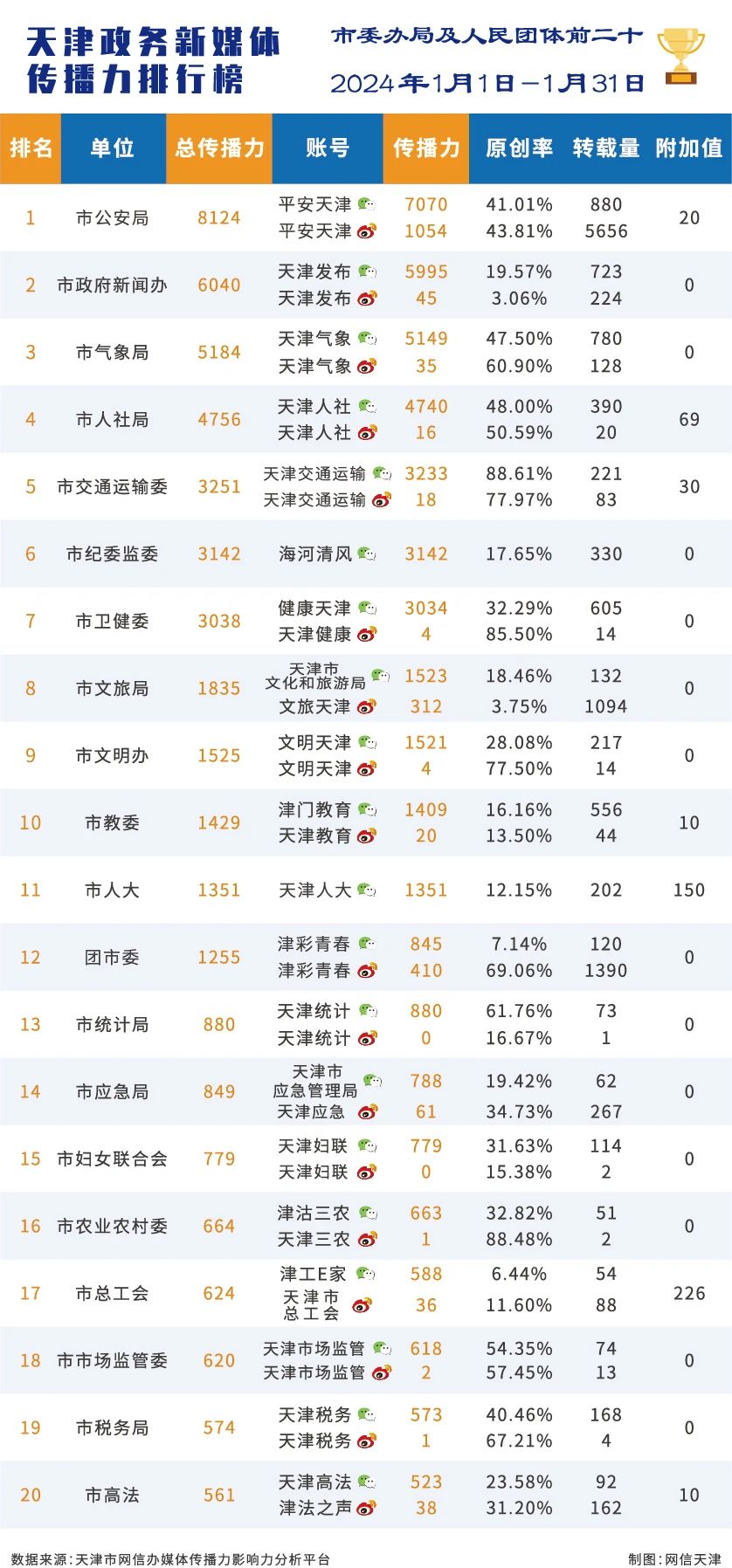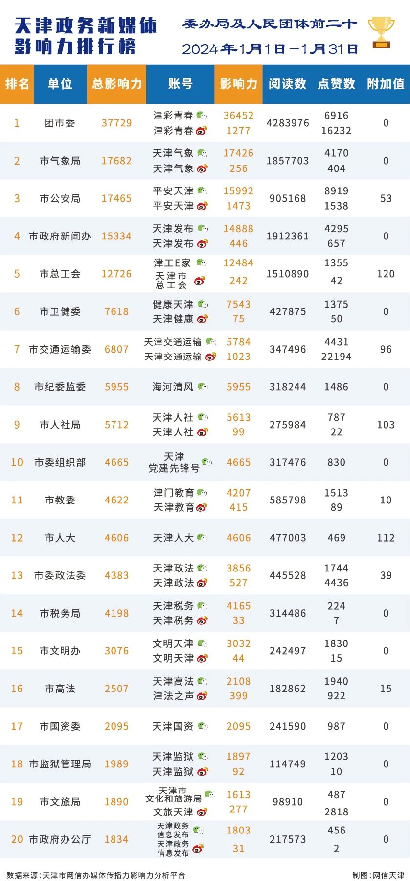 市委网信办发布天津政务新媒体2024年1月份传播影响力排行榜