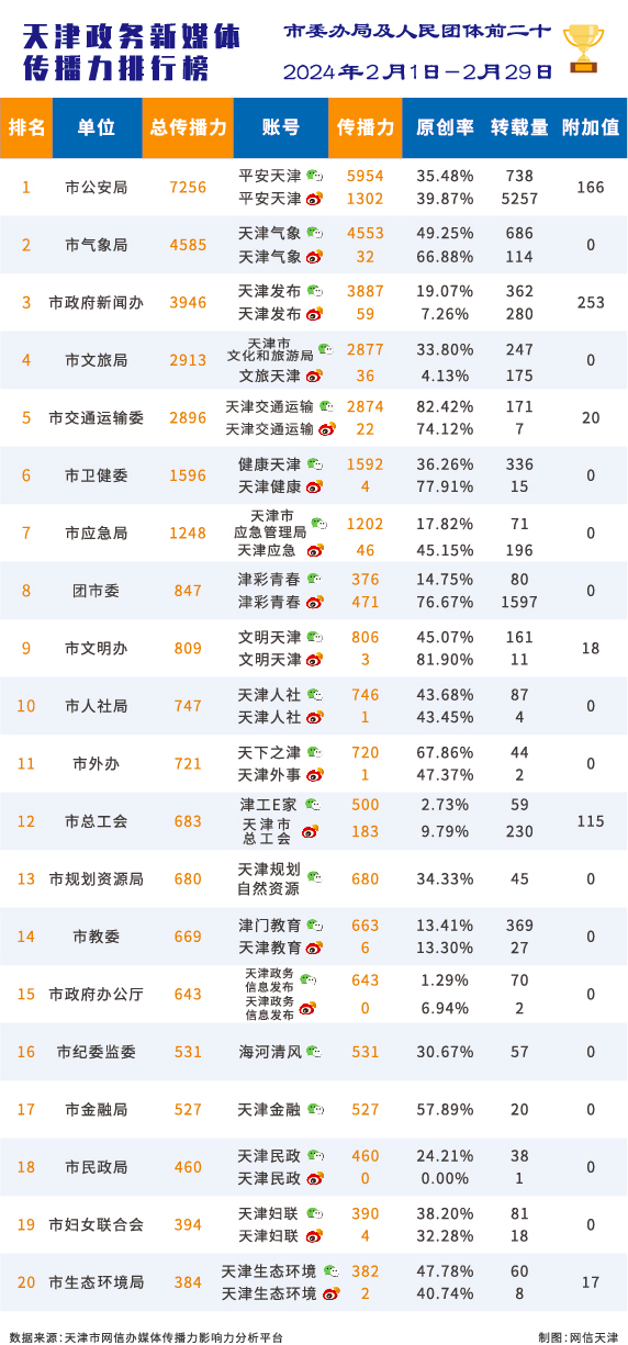 市委网信办发布天津政务新媒体2024年2月份传播影响力排行榜