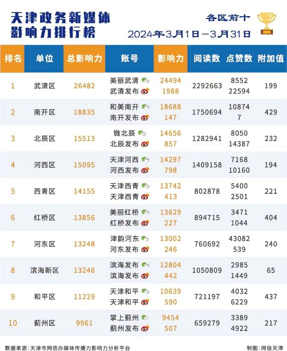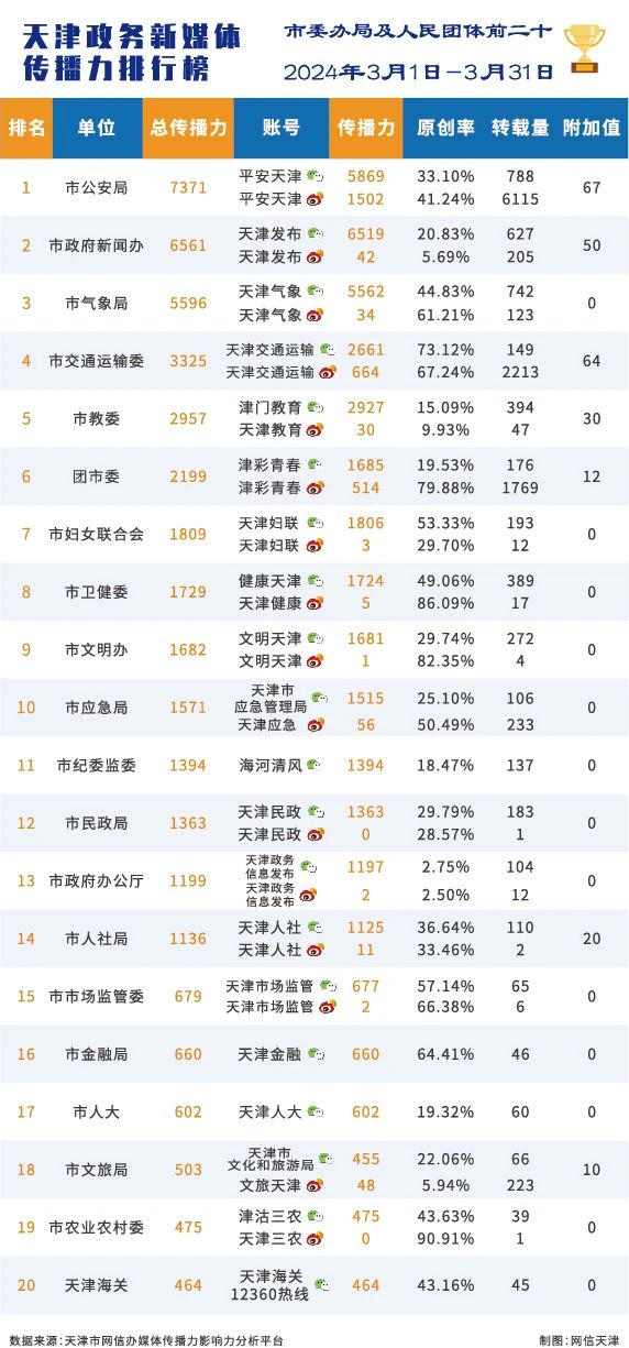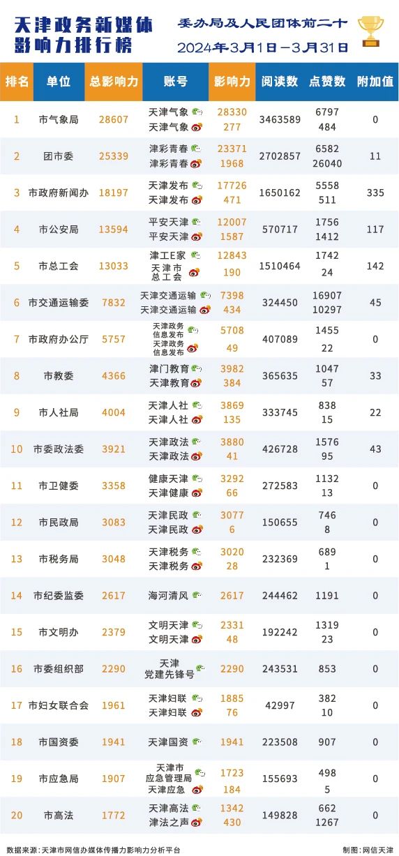 市委网信办发布天津政务新媒体2024年3月份传播影响力排行榜