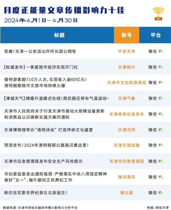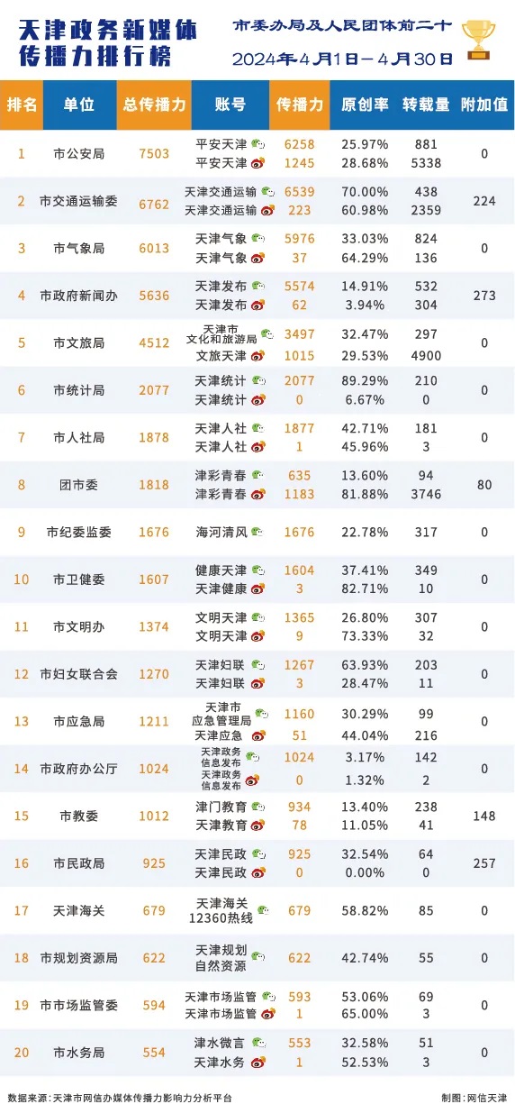 市委网信办发布天津政务新媒体2024年4月份传播影响力排行榜