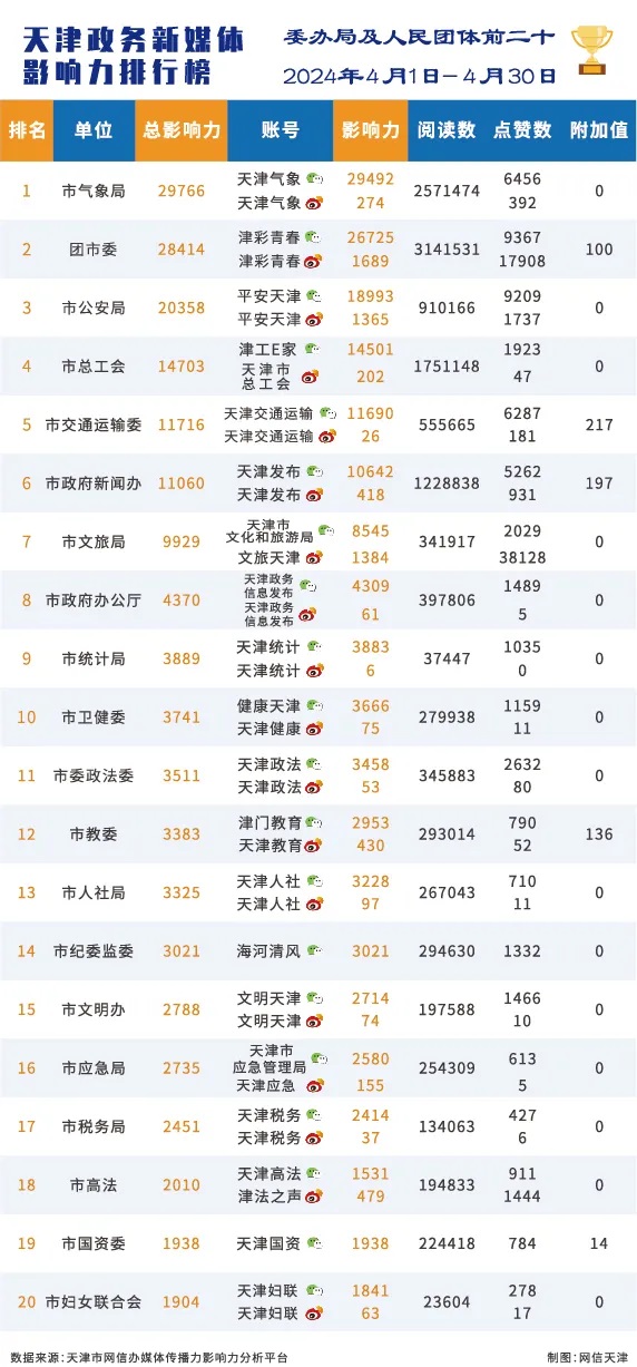 | 2024年4月份天津政务新媒体传播影响力排行榜 |