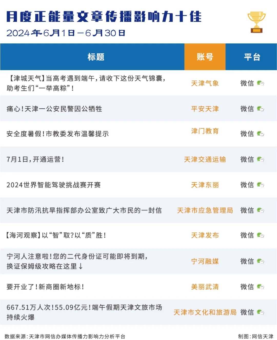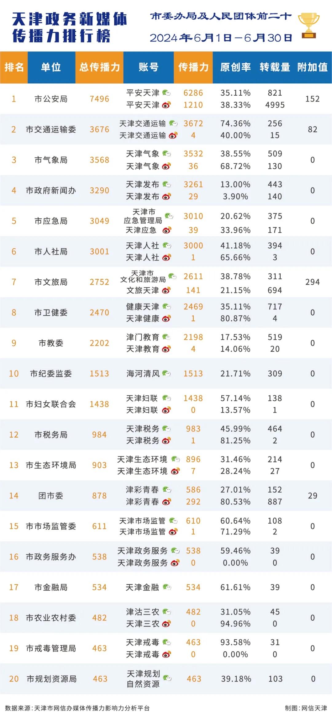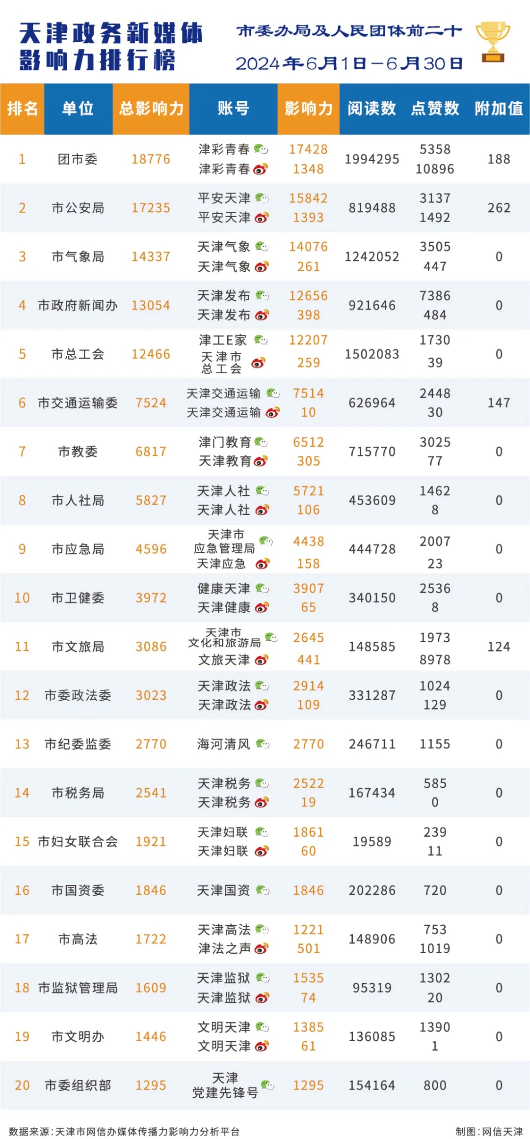 | 2024年6月份天津政务新媒体传播影响力排行榜 |