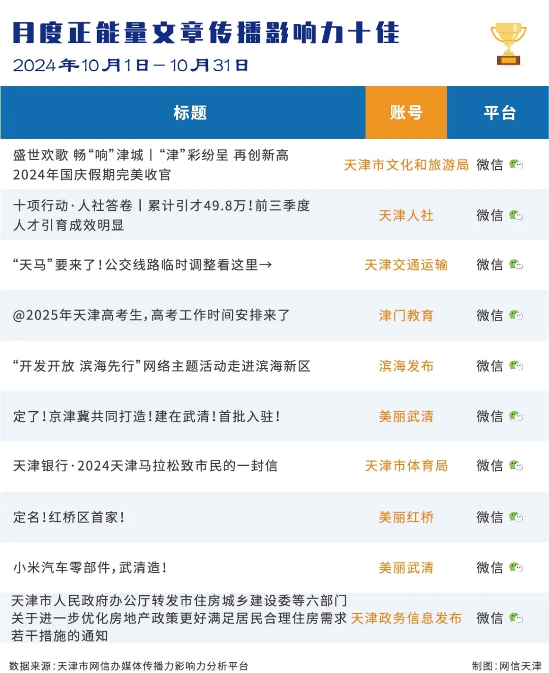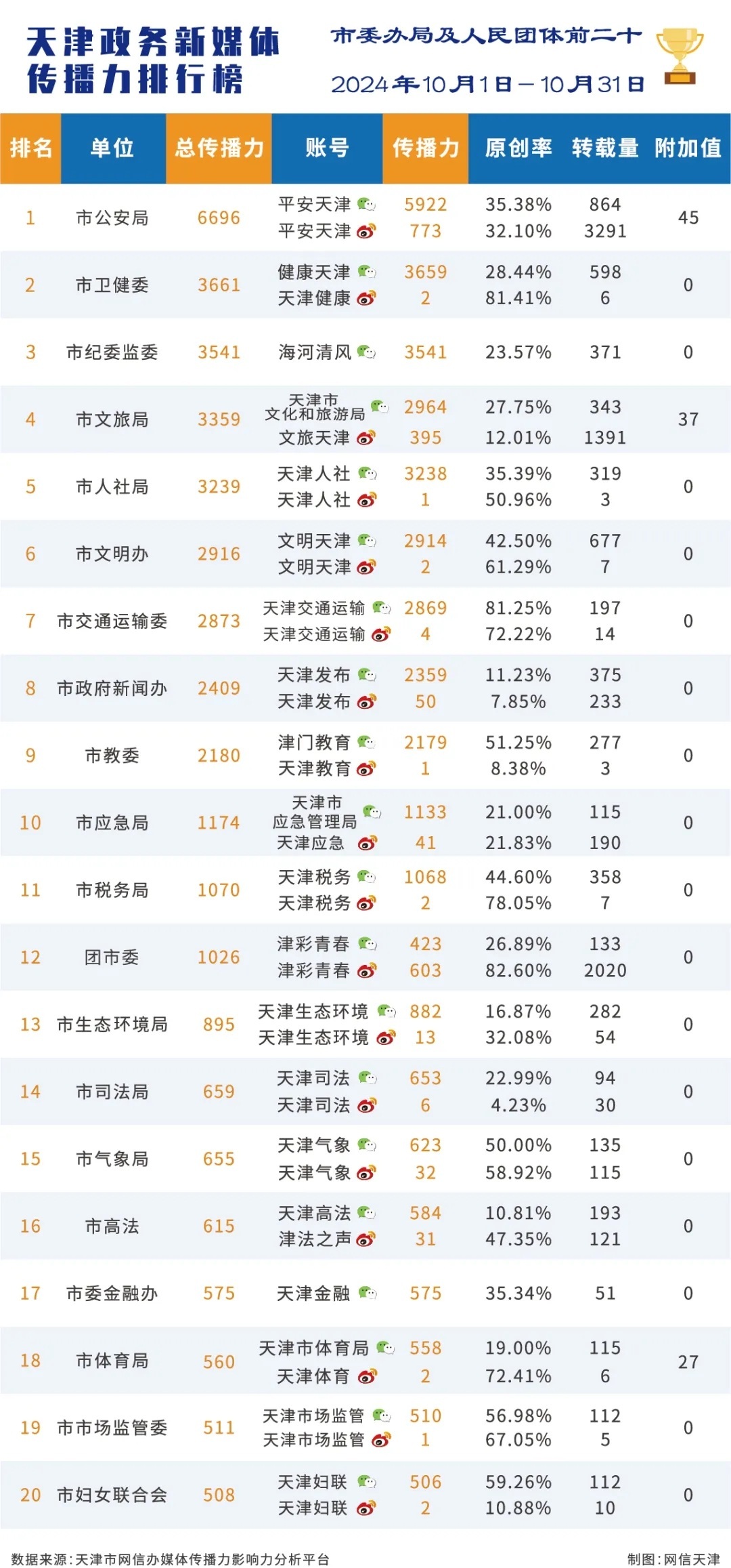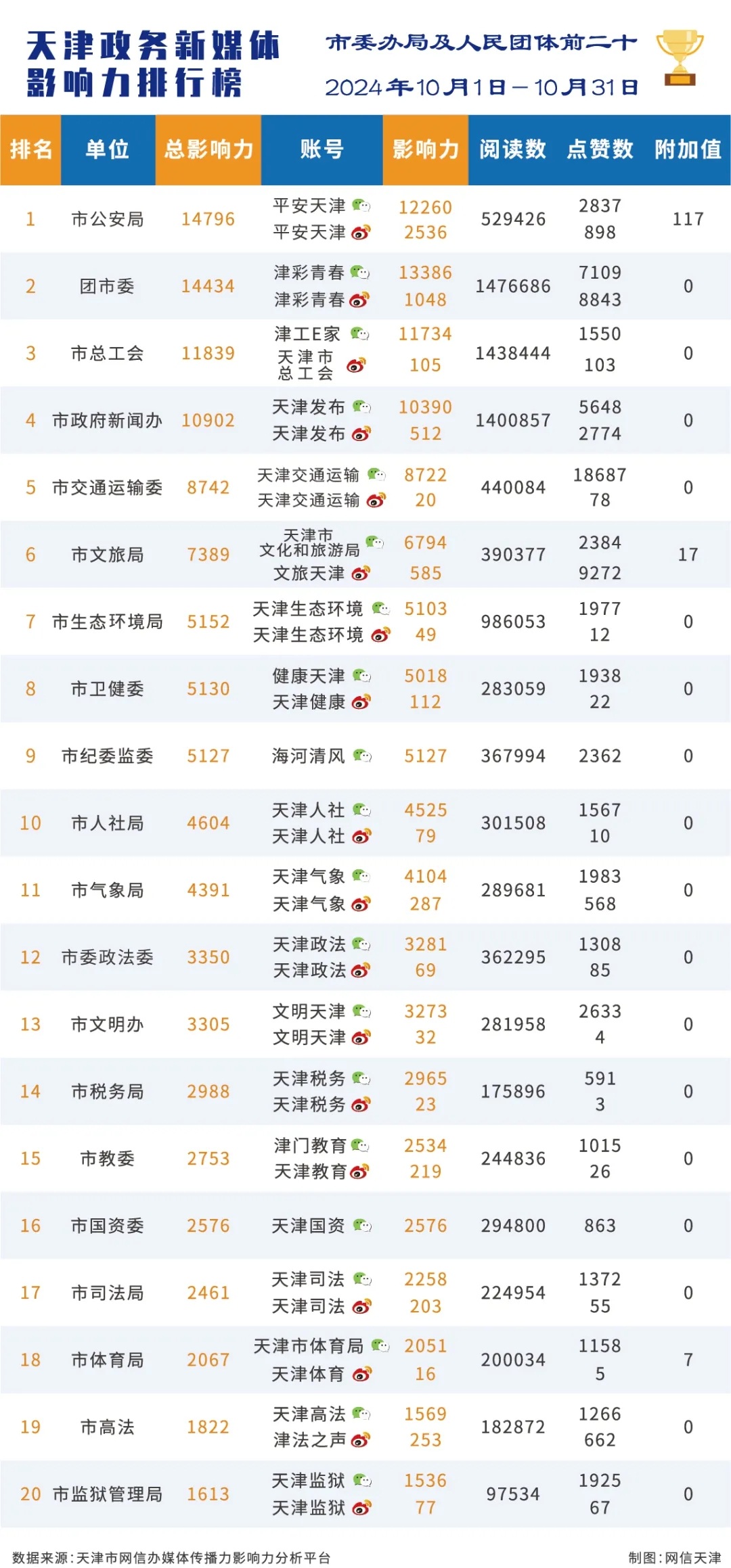 | 2024年10月份天津政务新媒体传播影响力排行榜 |