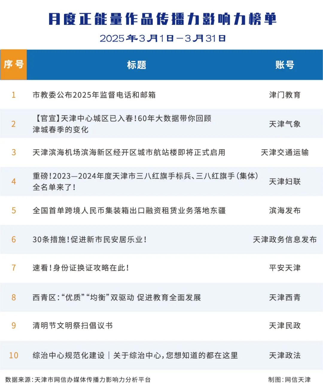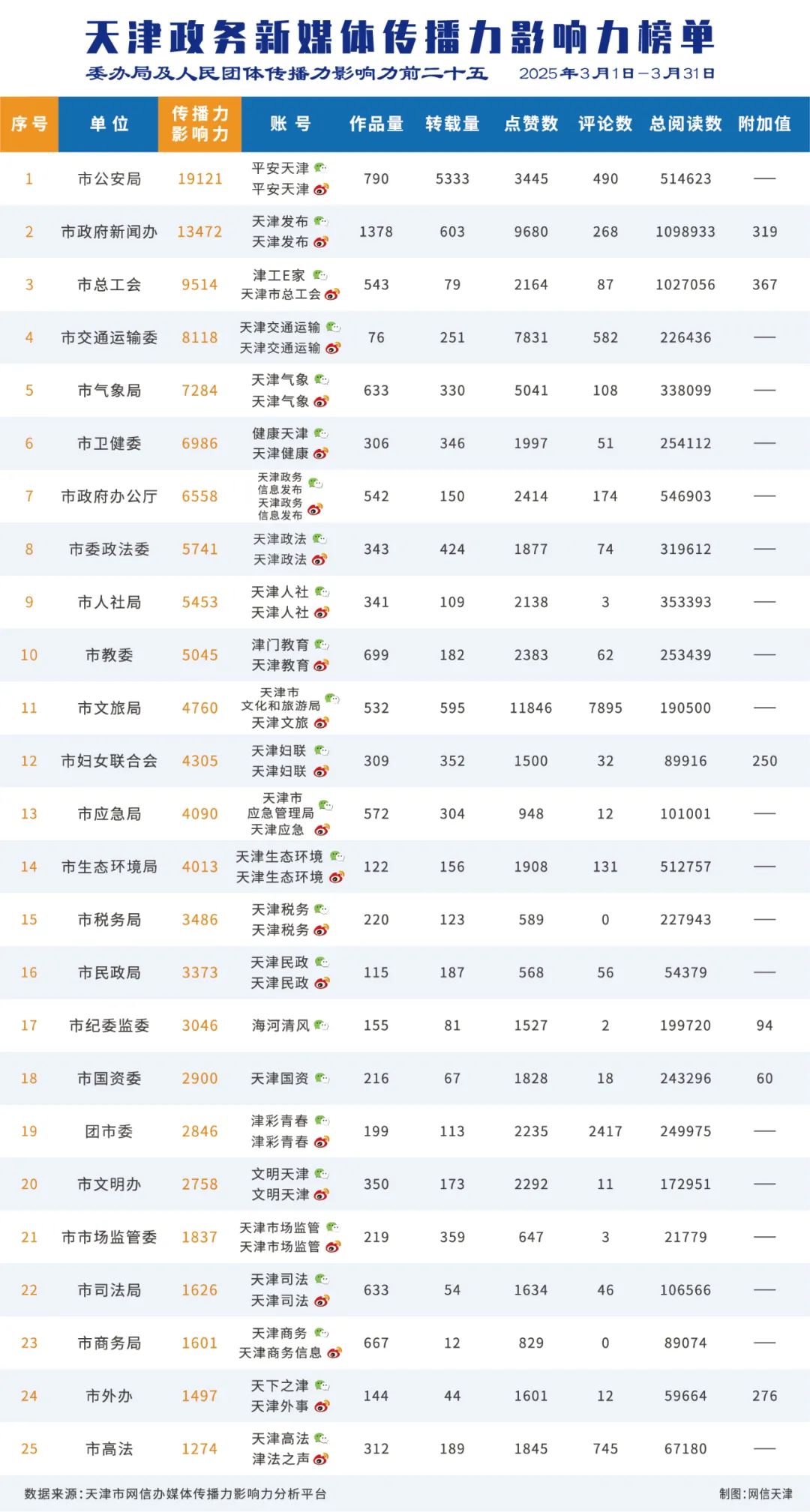| 2025年3月份天津政务新媒体传播力影响力榜单 |