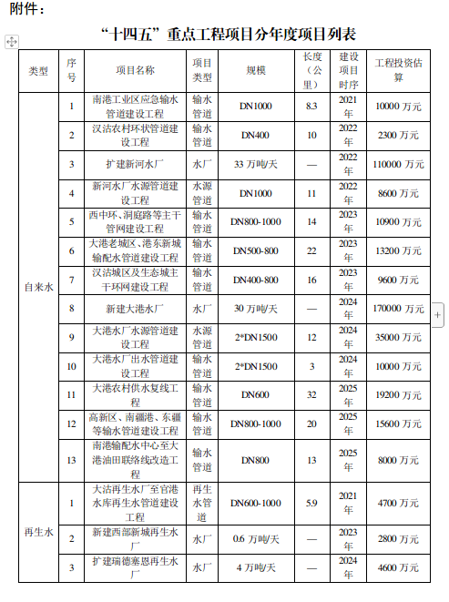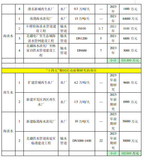 三是推广非常规水资源开发。合理统筹资源配置,实现“稳水源、优配置、多场景、促应用”的目标。规划扩建2座再生水厂,新建3座再生水厂,新建再生水管道23.9公里。新建南港、临港2座海水淡化厂,新建海水淡化管道29公里。涉及工程14项,投资估算为20.30亿元,根据资金情况,在“十四五”期间完成部分项目的启动工作,深度处理再生水每年达到0.4亿立方米。