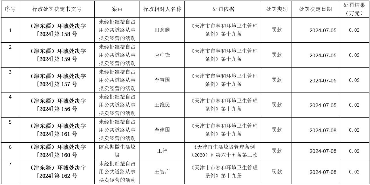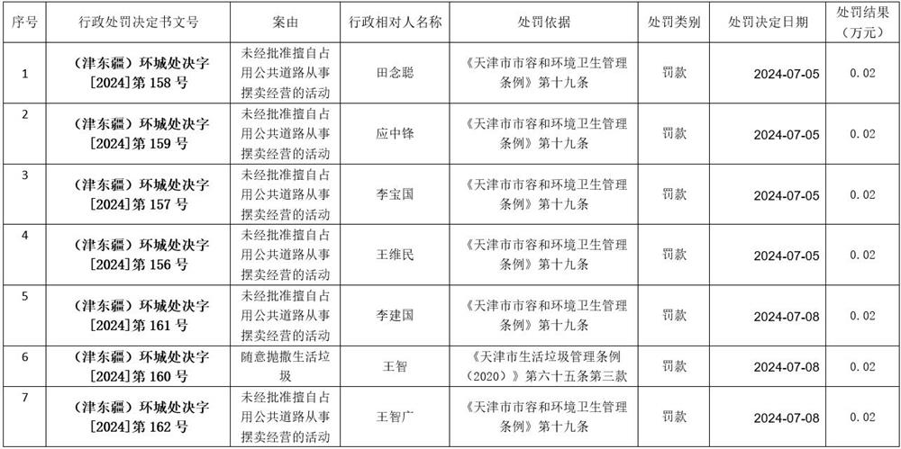 2024年7月5日至7月8日城市管理行政处罚信息