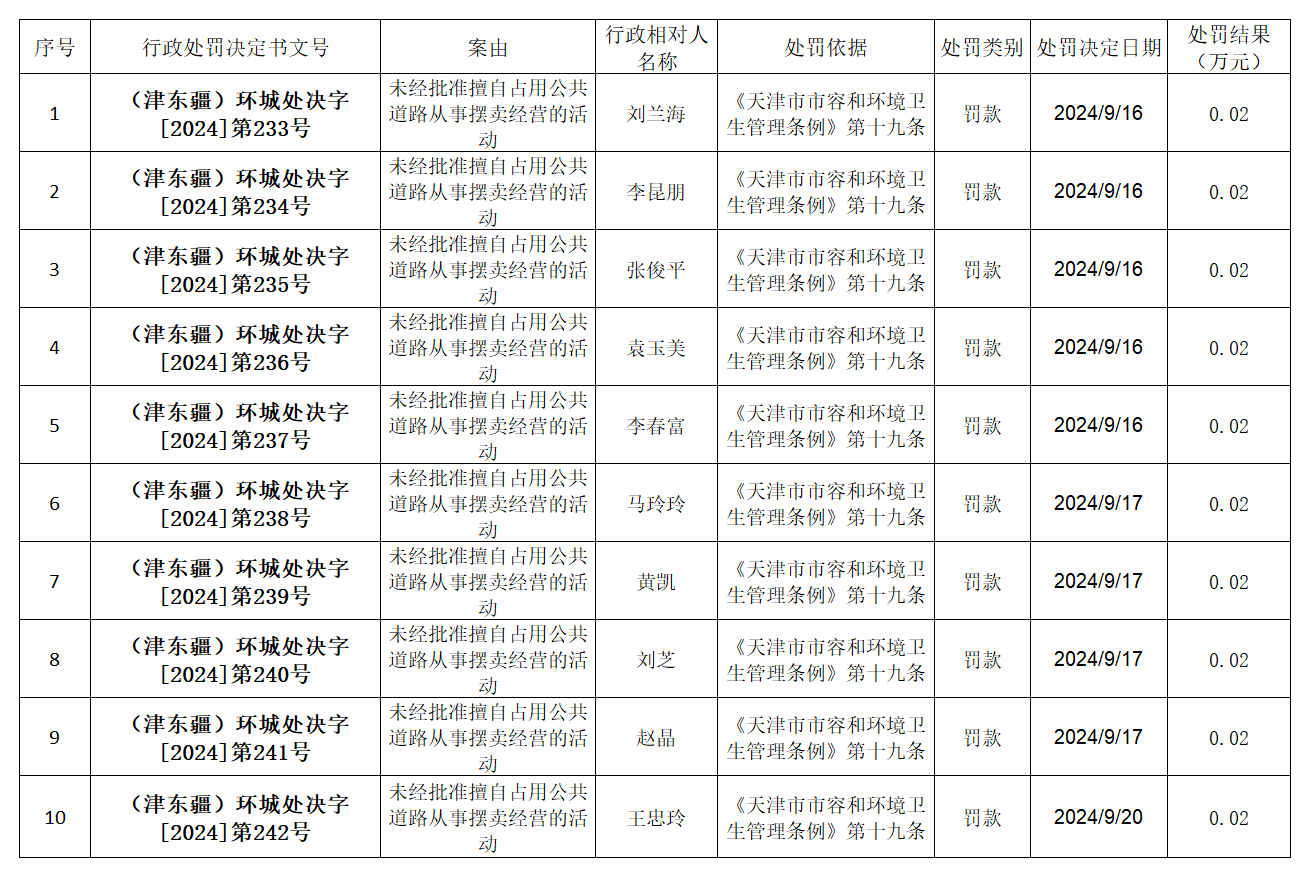 2024年9月16日至9月20日城市管理行政处罚信息