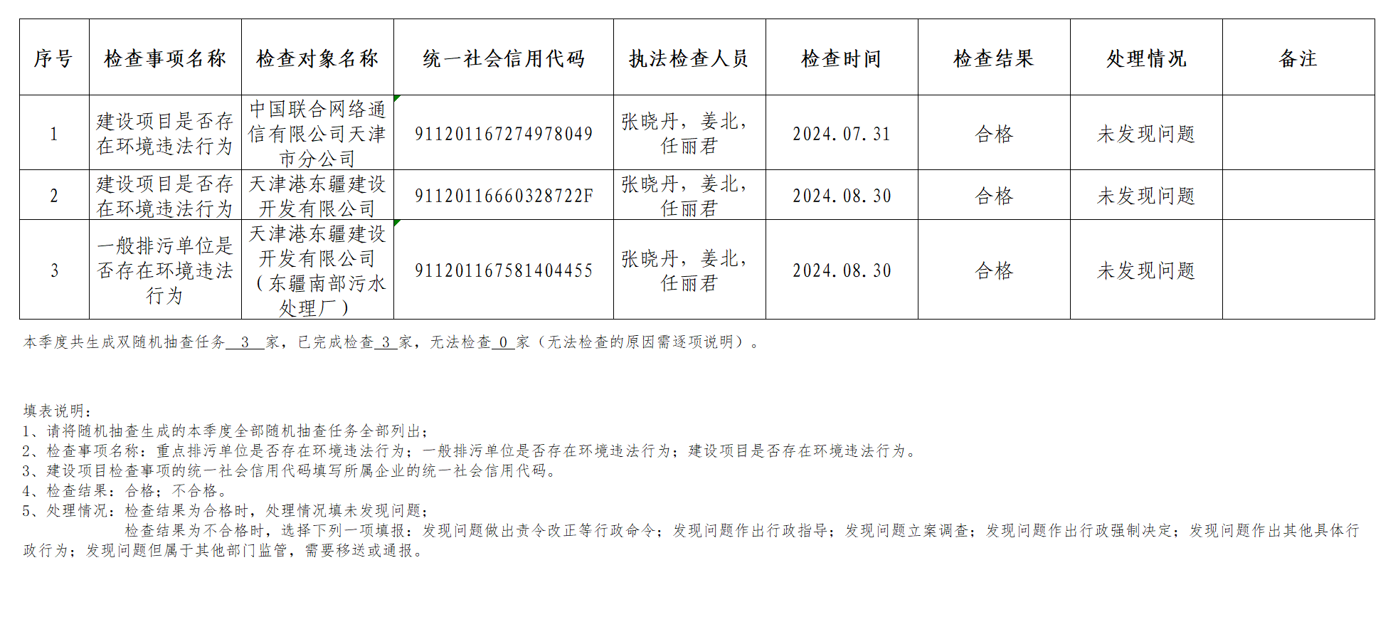 东疆综合保税区生态环境和城市管理局2024年第3季度双随机检查任务检查结果公示表
