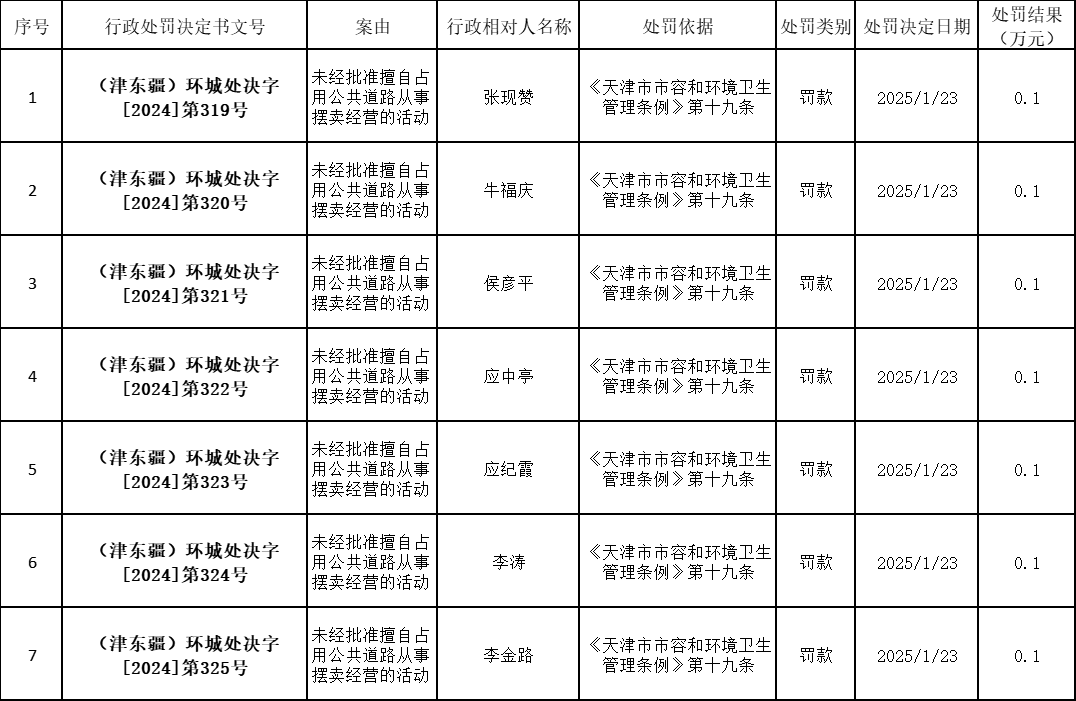 2025年1月23日城市管理行政处罚信息