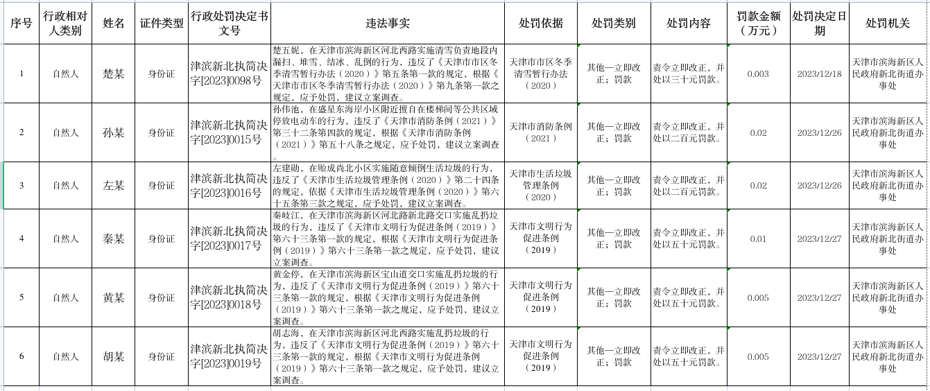 新北街道行政处罚公示2023年12月份