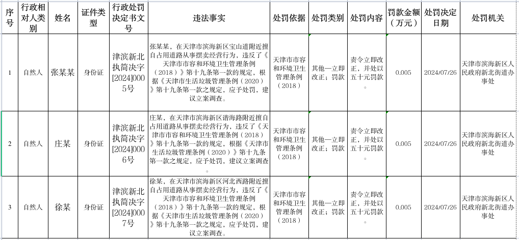 2024年8月新北街道行政处罚公示