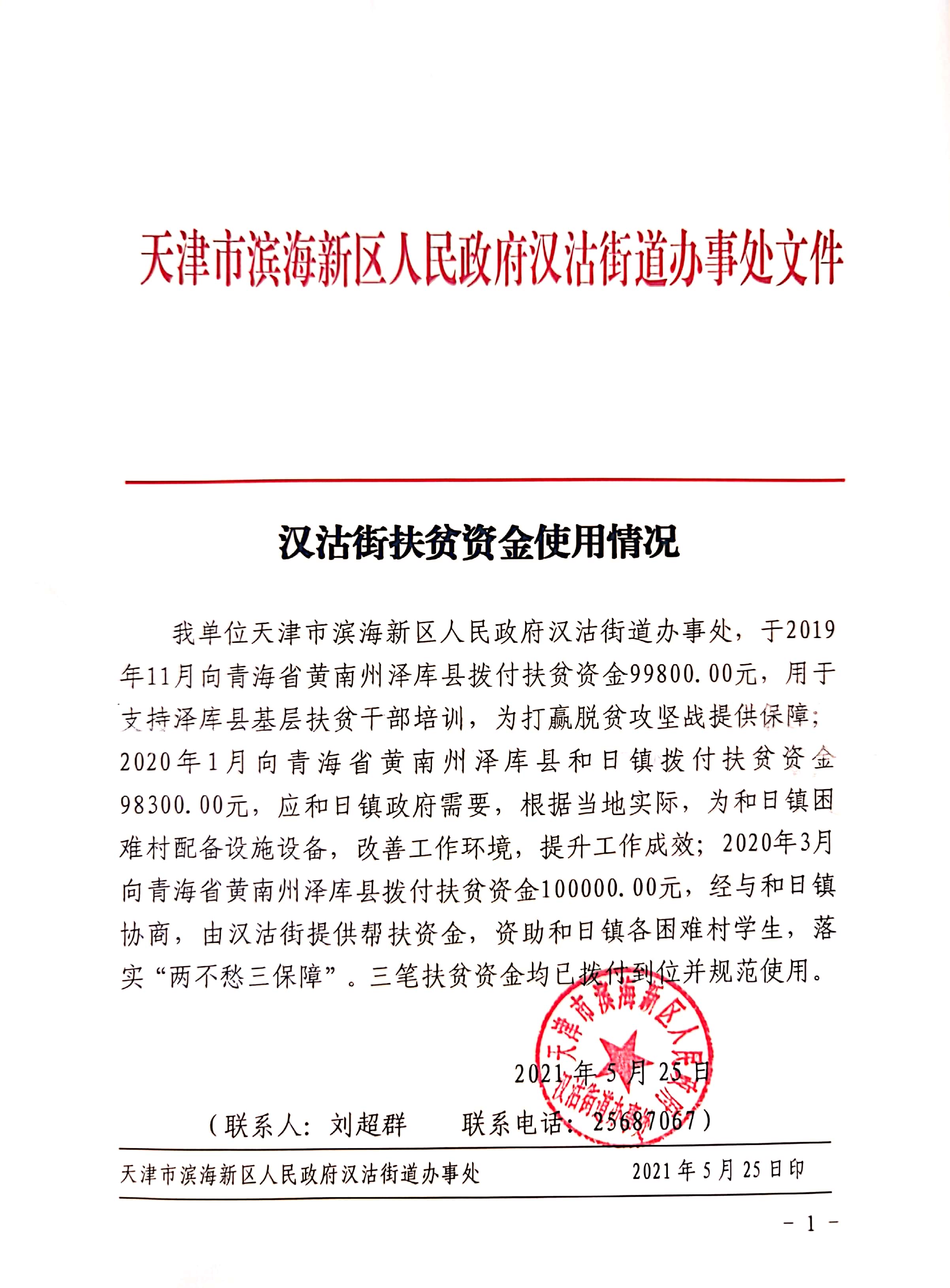 我单位天津市滨海新区人民政府汉沽街道办事处,于2019年11月向青海省黄南州泽库县拨付扶贫资金99800.00元,用于支持泽库县基层扶贫干部培训,为打赢脱贫攻坚战提供保障;2020年1月向青海省黄南州泽库县和日镇拨付扶贫资金98300.00元,应和日镇政府需要,根据当地实际,为和日镇困难村配备设施设备,改善工作环境,提升工作成效;2020年3月向青海省黄南州泽库县拨付扶贫资金100000.00元,经与和日镇协商,由汉沽街提供帮扶资金,资助和日镇各困难村学生,落实“两不愁三保障”。三笔扶贫资金均已拨付到位并规范使用。
