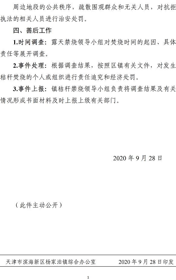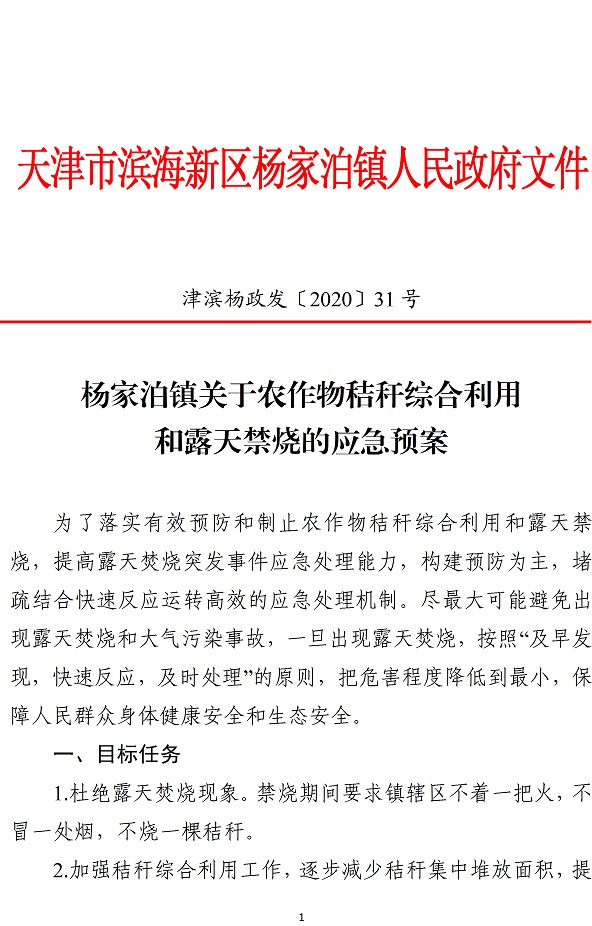 杨家泊镇《关于农作物秸秆综合利用和露天禁烧的决定》应急预案