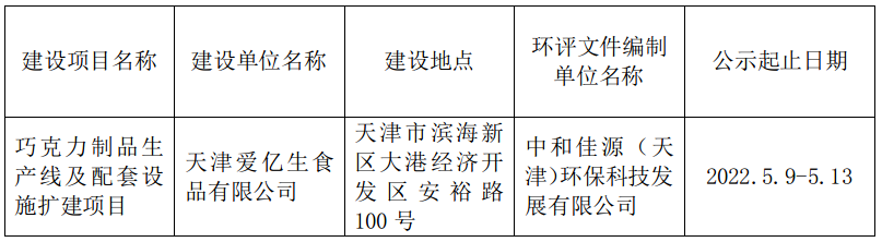 | 天津市滨海新区中塘镇综合便民服务中心关于对天津爱亿生食品有限公司巧克力制品生产线及配套设施扩建项目环境影响报告表受理情况的公示 |