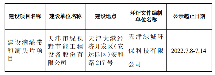 | 天津市滨海新区中塘镇综合便民服务中心关于对天津市绿视野节能工程设备股份有限公司建设滴灌带和滴头片项目环境影响报告表受理情况的公示 |