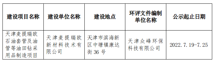 | 天津市滨海新区中塘镇综合便民服务中心关于对天津麦提瑞欧新材料技术有限公司天津麦提瑞欧石油套管及油管等油田钻采用品制造项目环境影响报告表受理情况的公示 |