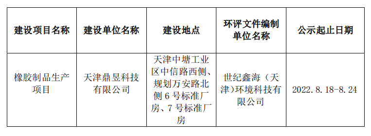 | 天津市滨海新区中塘镇综合便民服务中心关于对天津鼎昱科技有限公司橡胶制品生产项目环境影响报告表受理情况的公示 |