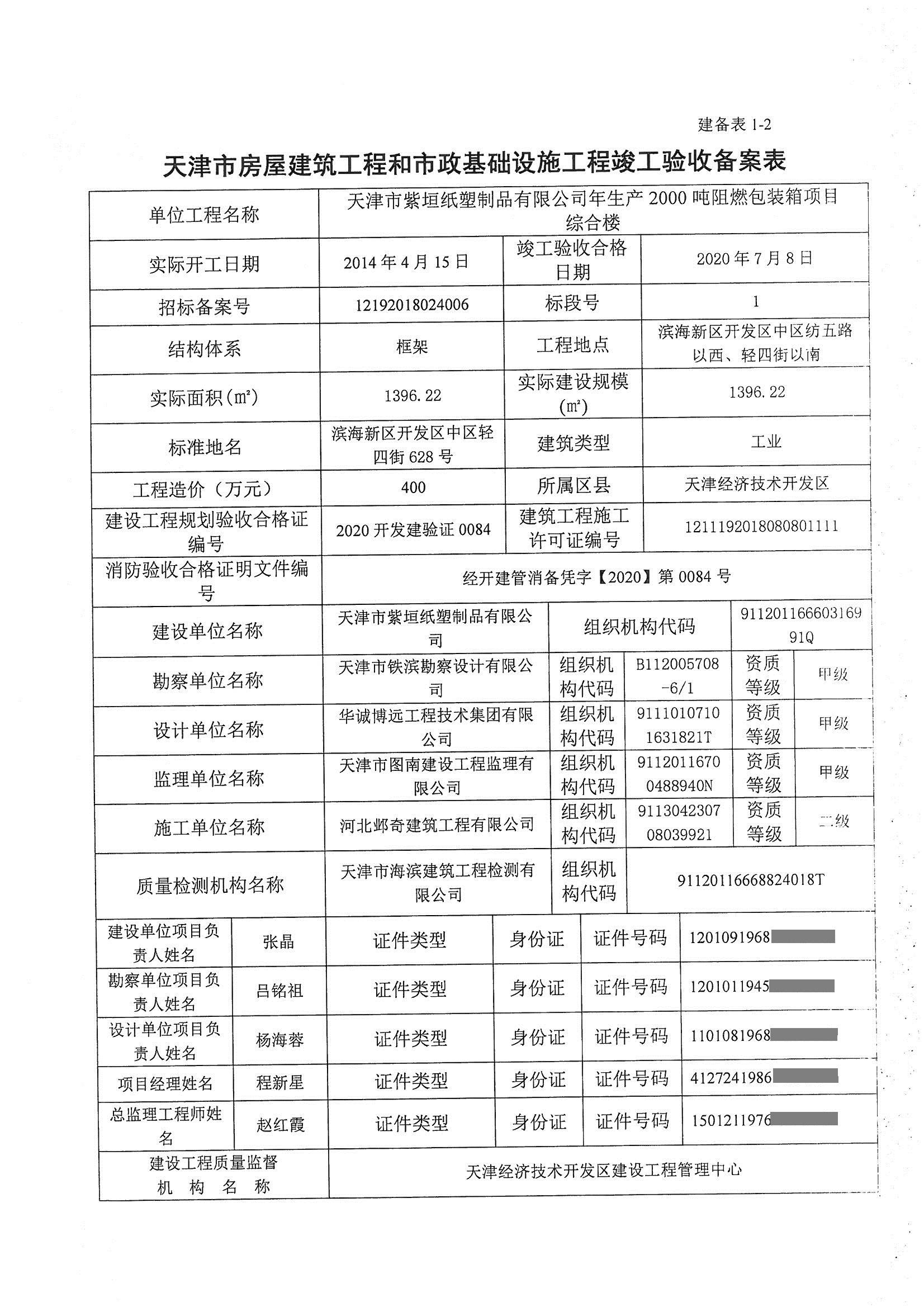 天津市紫垣纸塑制品有限公司年生产2000吨阻燃包装箱项目综合楼竣工验收备案