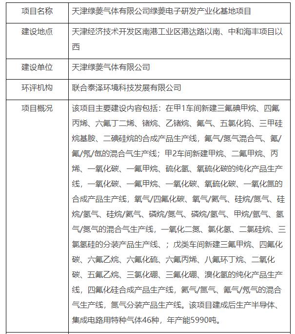 | 天津绿菱气体有限公司绿菱电子研发产业化基地项目环境影响报告表拟审批意见公示 |