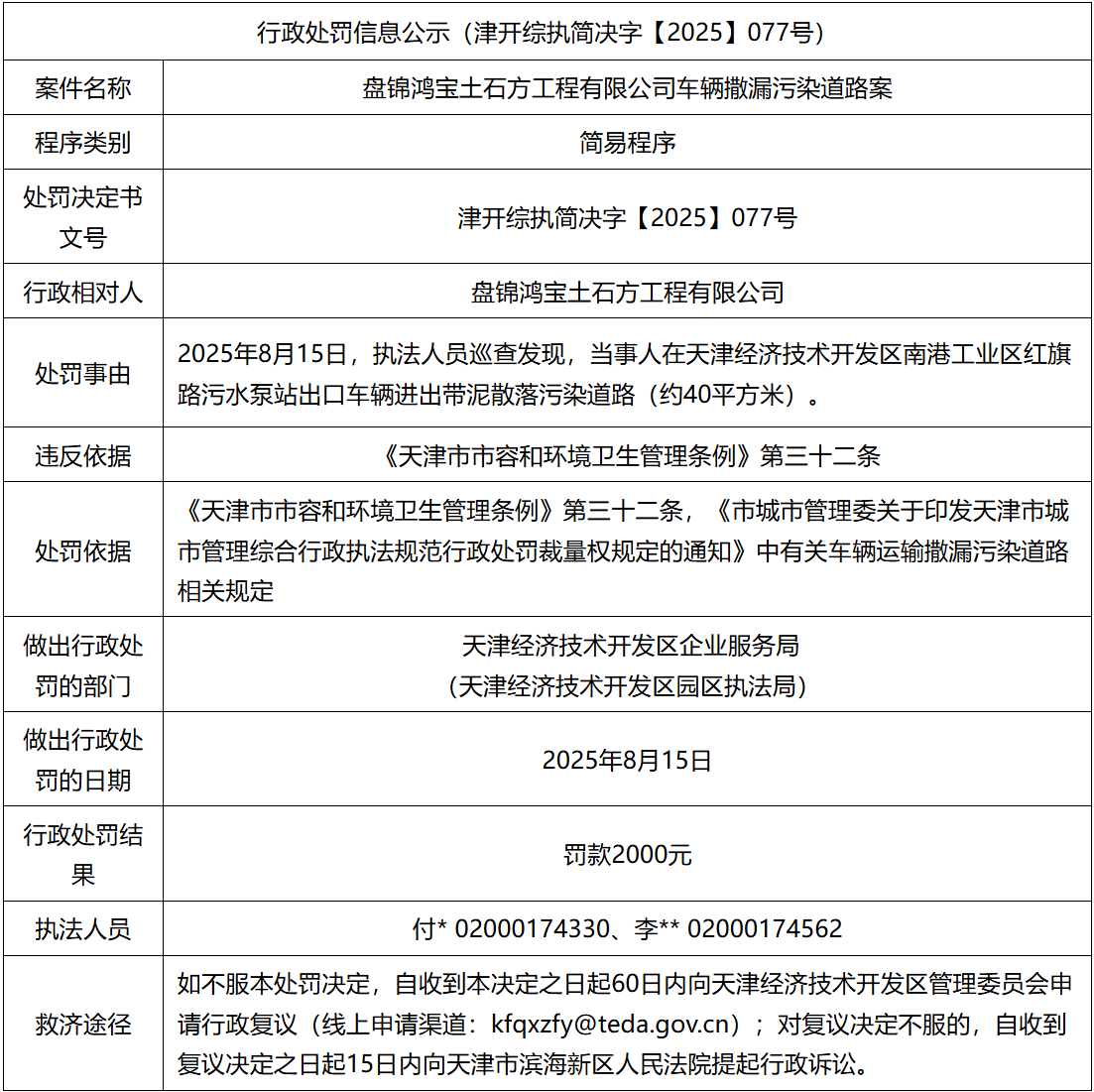 行政处罚信息公示(津开综执简决字【2025】077号)