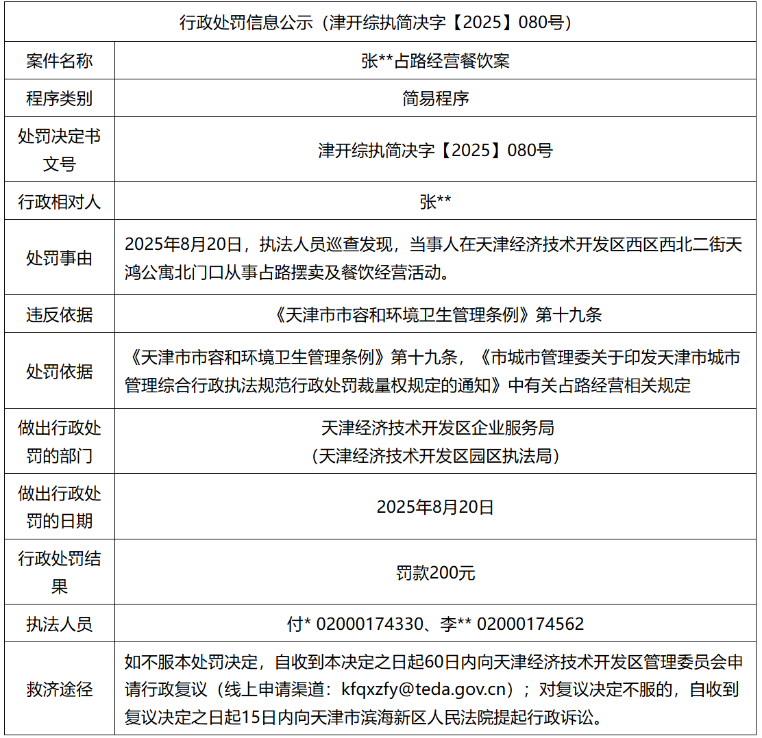 行政处罚信息公示(津开综执简决字【2025】080号)