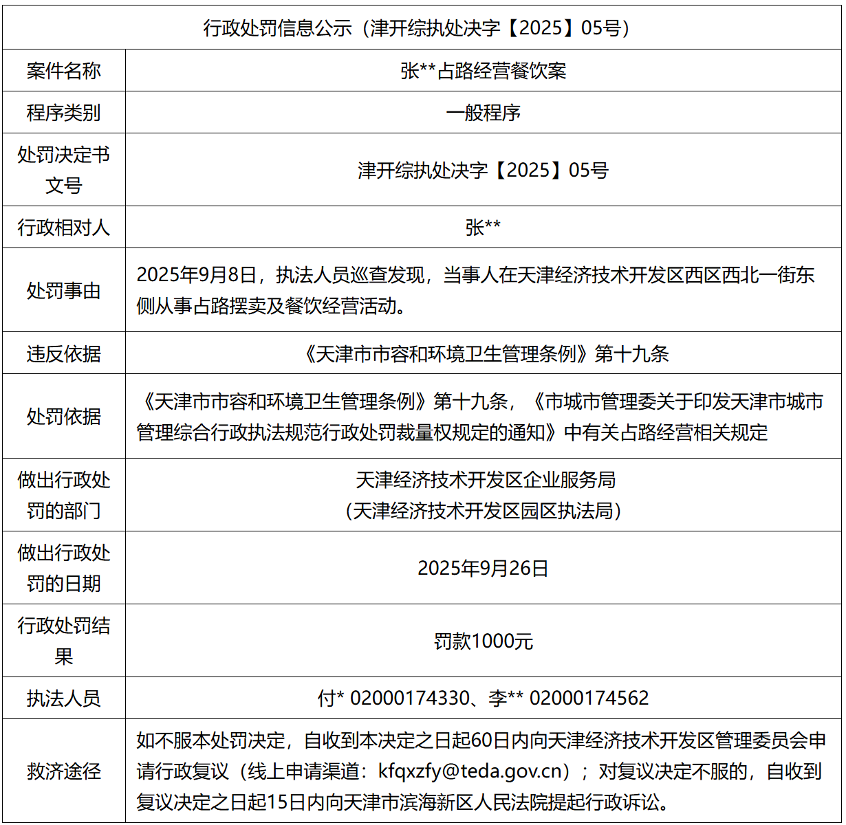 行政处罚信息公示(津开综执处决字【2025】05号)