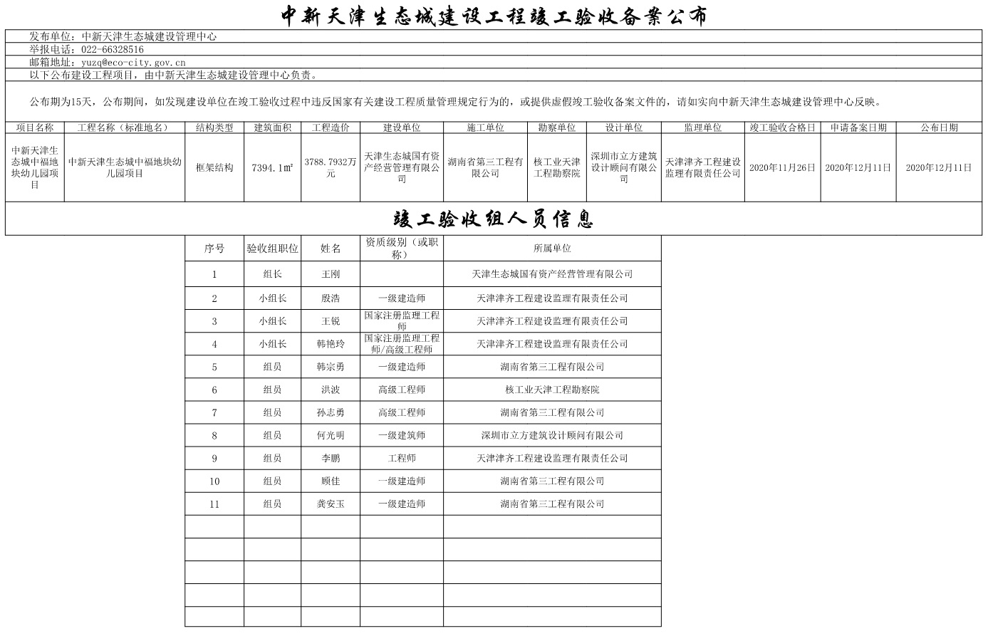 中新天津生态城中福地块幼儿园项目竣工验收备案公布