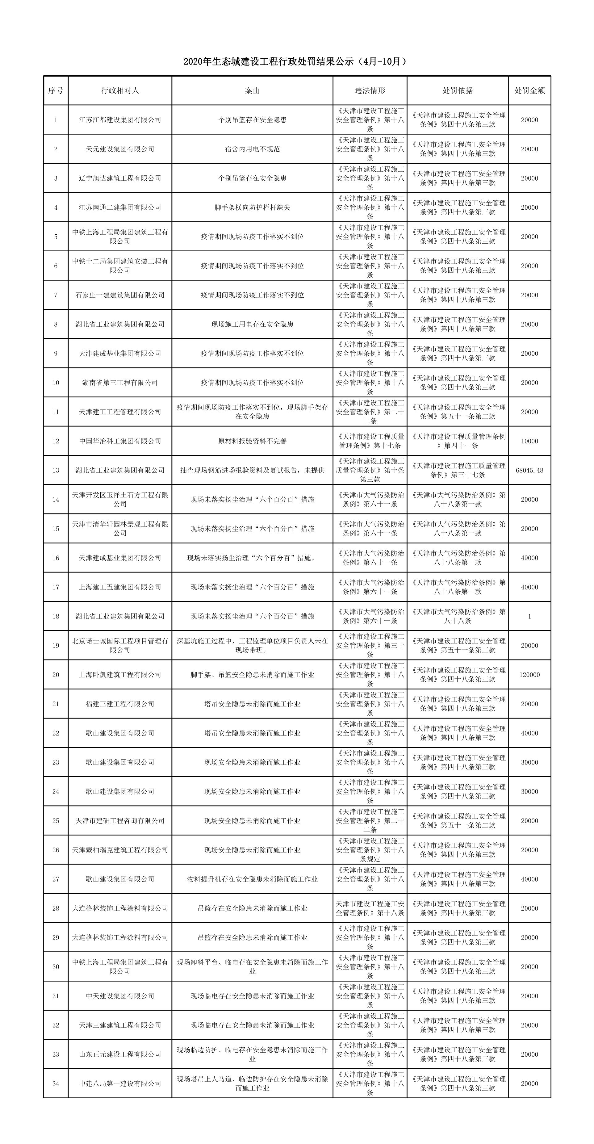 2020年生态城建设工程行政处罚结果公示(4-10月份)
