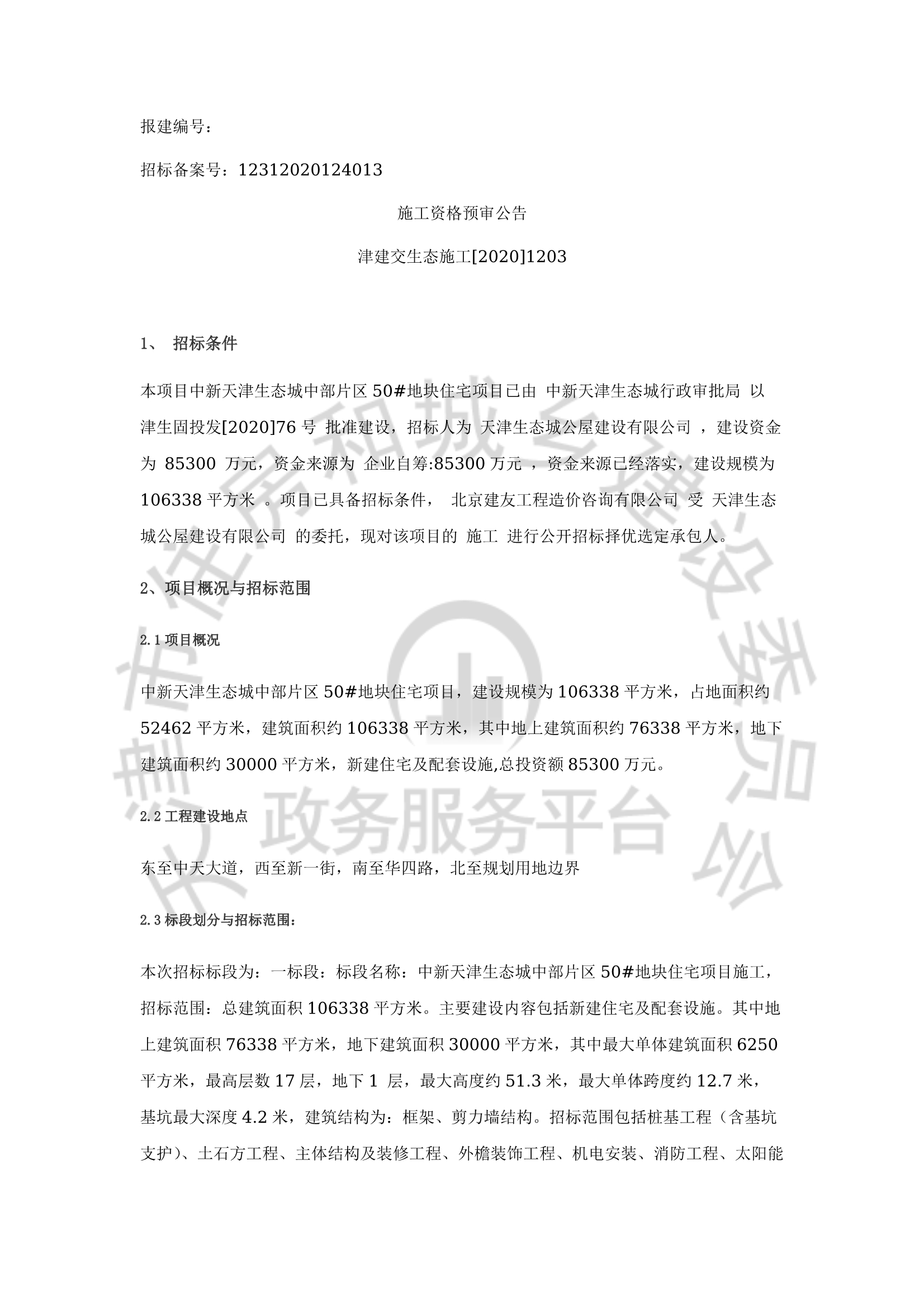 中新天津生态城中部片区50#地块住宅项目施工招标公告